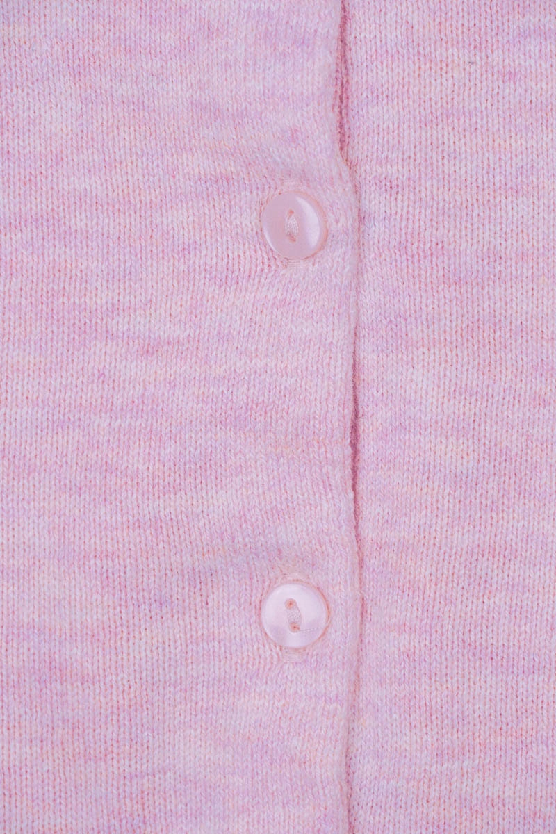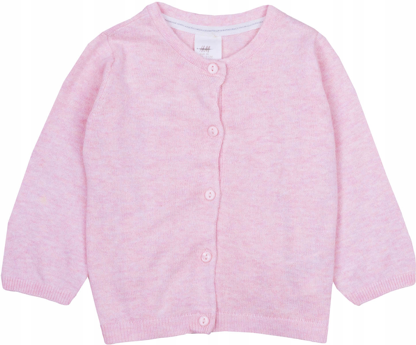 Новий кардиган від H&M. Меланж, у відтінку пудрово-рожевого. Застібається спереду на рожеві гудзики. Круглий виріз. Светр з довгим рукавом. Рукава та низ светра оброблені рантом. Всередині смужка, на якій застібаються ґудзики, закріплена приємною на дотик окантовкою, яка запобігає натиранню.