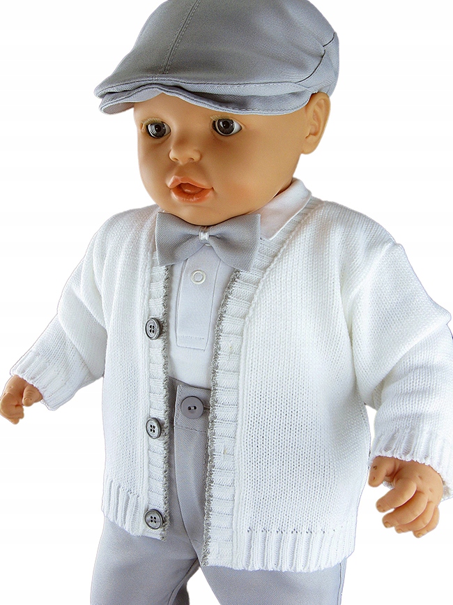 - білий светр із сірими аксесуарами, довгими рукавами, застібається на ґудзики, виготовлений зі 100% італійської акрилової пряжі, характеризується великою м’якістю та довговічністю у використанні. < /ul>
