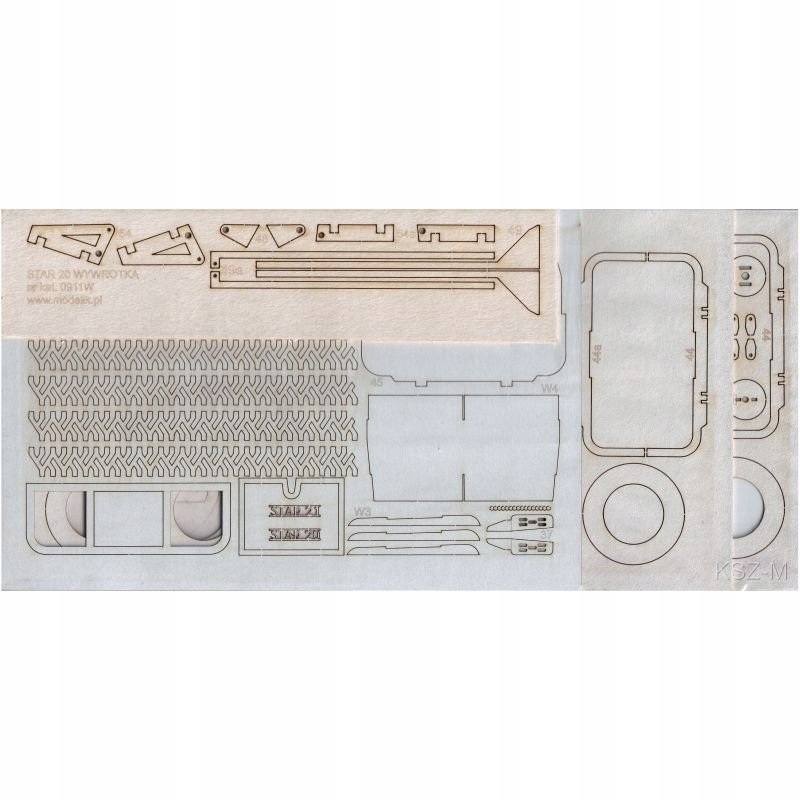 Вирізані лазером елементи моделі, які в оригінальному вирізі потребують склеювання відповідної товщини картону. Ці елементи точно вирізаються лазерним плотером відразу в картоні відповідної товщини і вимагають лише виштовхування з аркуша пальцем (вони з'єднані лише маленькими з'єднувачами).