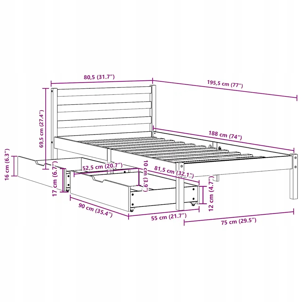 Каркас ліжка з сосни восковий коричневий 195,5 х 80,5 х 69,5 см з ящиками