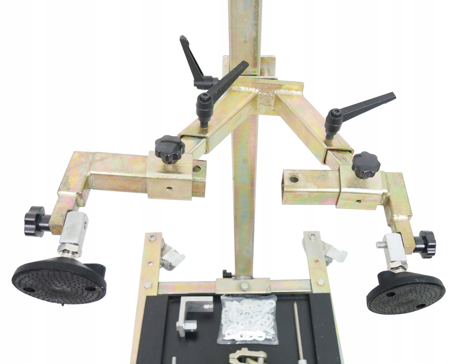 ☑️ Швидке рихтування бокового кузова (і не тільки) здійснюється за допомогою вертикальної балки, оснащеної мобільним візком з регульованими гумовими опорами, які підтримуються посиленими елементами кузова поблизу місця ремонту. Потім гвинтом, спрямованим у зону ремонту, видаляється вм’ятина.