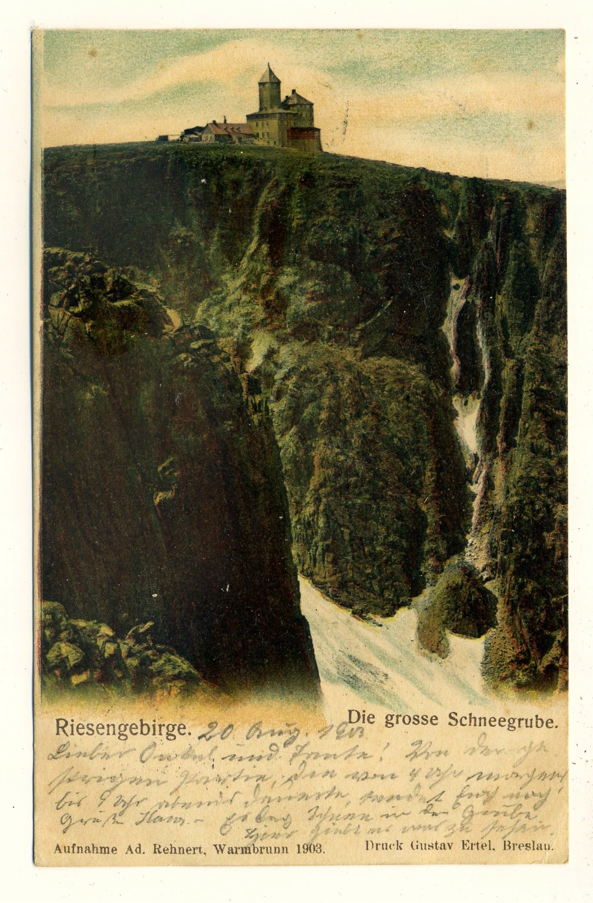сьогодні на аукціоні листівка з гір Карконоше - Wielki Śnieżny Kocioł, притулок "Nad Śnieżnych Kotły" на задньому плані, надіслана в 1903 році, в дуже хорошому стані - (відмітки з альбому).