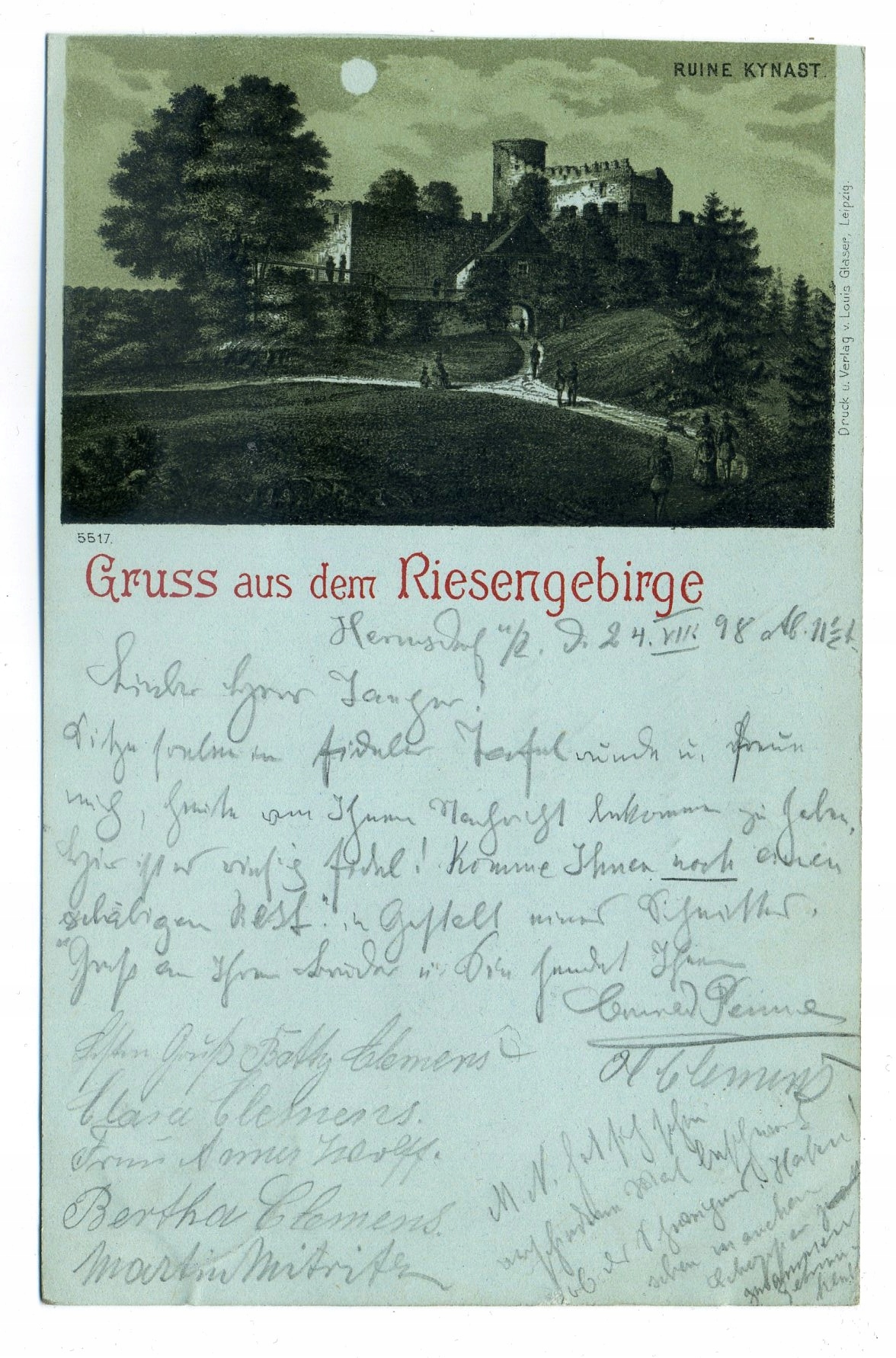 сьогодні на аукціоні листівка з гір Карконоше - руїни замку Хойнік, літографія, так звана "місячна", відправлена 1898 р. , в дуже хорошому стані .