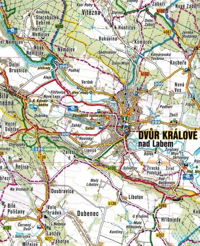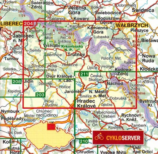 Складена, одностороння туристична карта Гігантських гір, Подкарконозе та Находсько за шкалою 1: 100 000, Czech Shocart Publishing. Duszniki-Zdrój на Сході, Добруськи, Храдек Кралове та Нові-Слошкова на півдні та Джиціна, Селі та Танвальд на Заході.