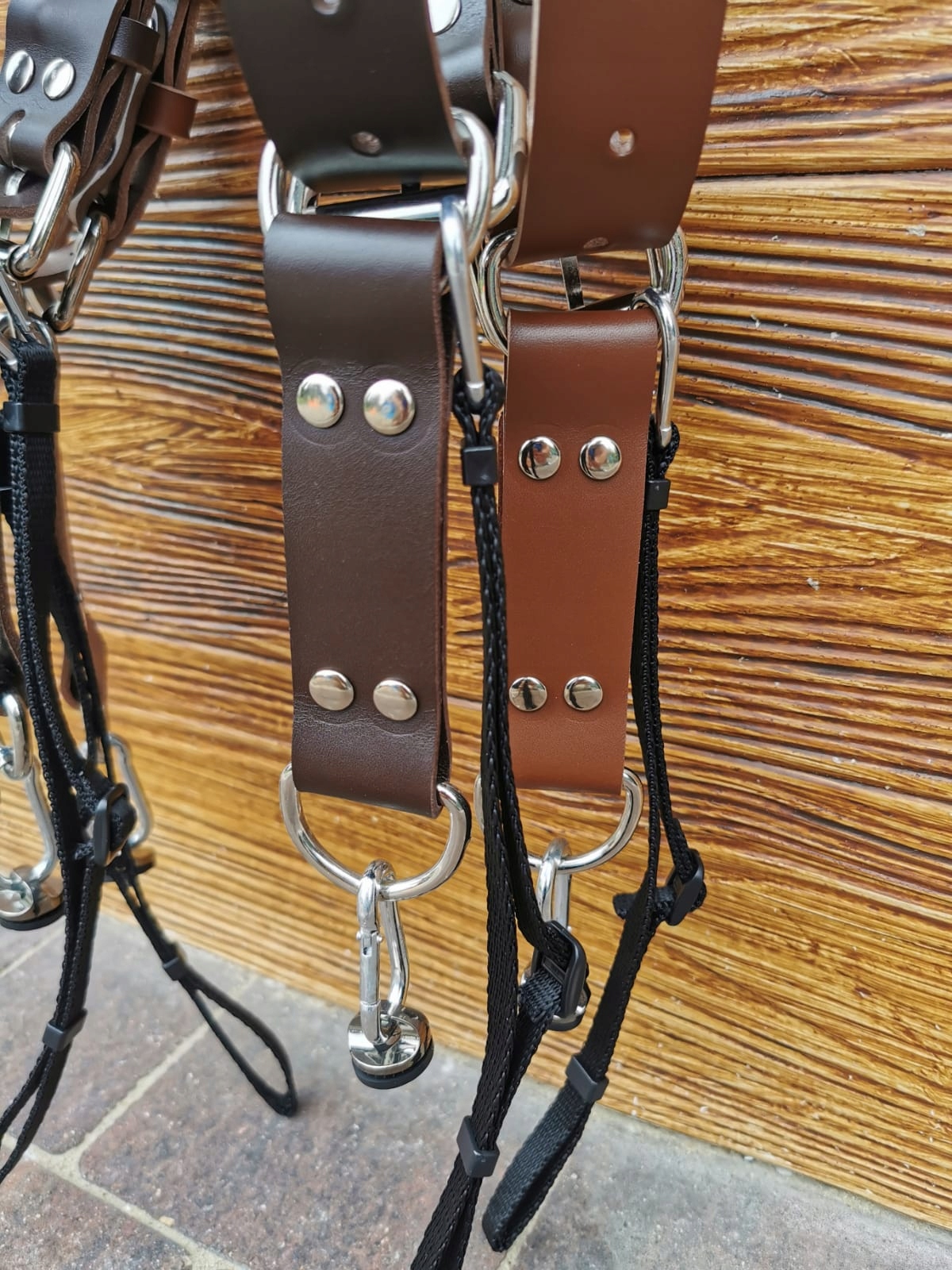 Брекети призначені для одного або двох тіла. Світло -коричнева шкіра (Carmel) - це італійська , має гарну структуру справжньої зернової шкіри. Камера кріпиться через 1/4 "універсальний гвинт та сталеву гвинтівку M5, тоді як роль розсувного елемента на шкірі грає сталевим кільцем D-кільце. Абсолютно необхідно дотримуватися принципу двох безпеки.