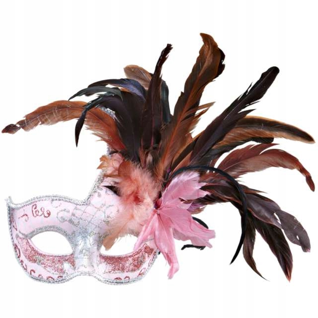 Чарівна рожева венеціанська маска - привабливий аксесуар в елегантному стилі, вона чудово підійде як елемент вашого вбрання на вишуканому карнавальному балу, новорічній вечірці або як цікаве доповнення до дівич-вечора. Маска ніжного рожевого кольору, має срібні прикраси. На лівій стороні маски є пір’я коричневого та рожевого кольору.