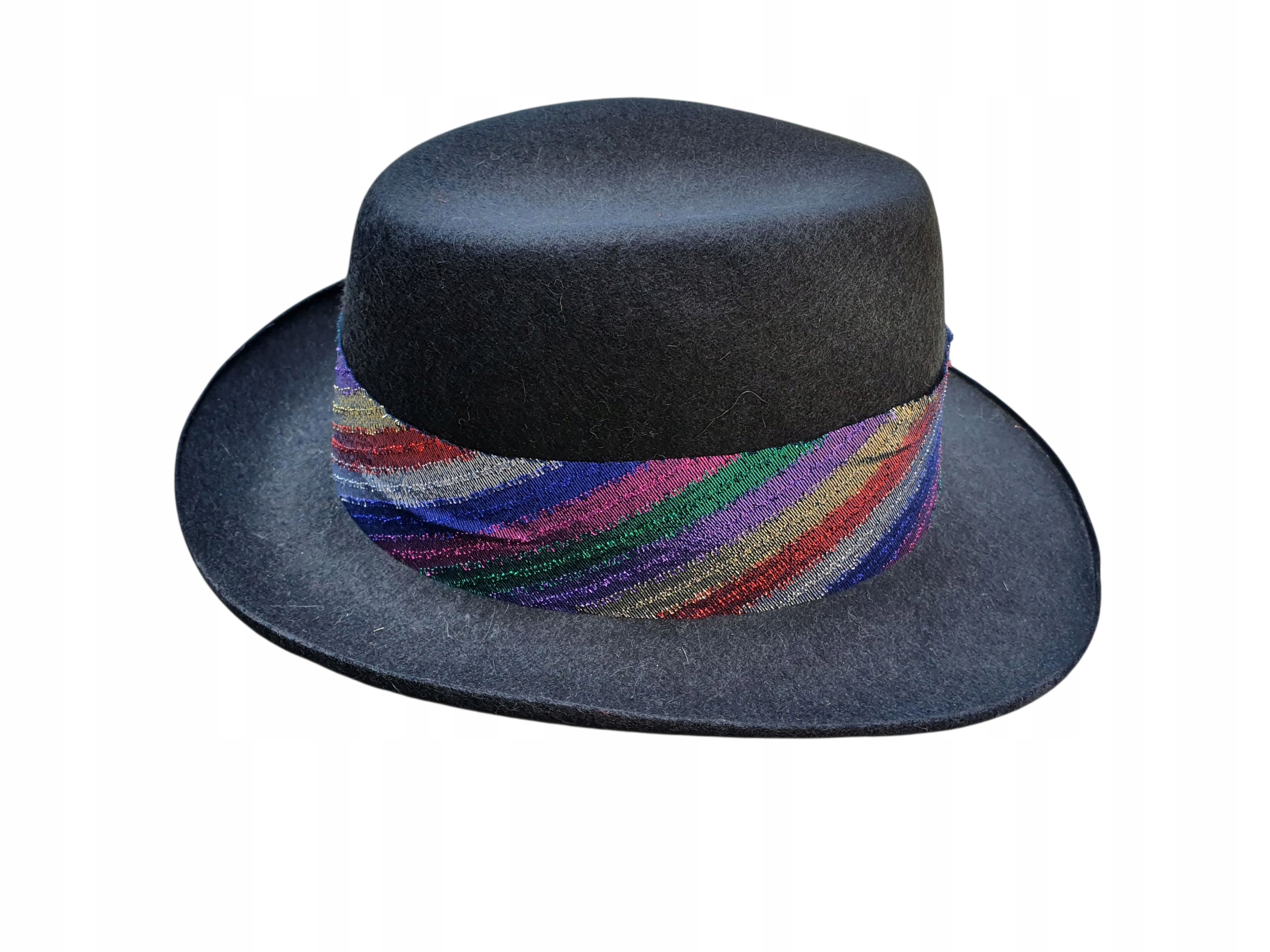 Гангстерський стиль з відтінком карнавального божевілля - класичний чорний колір порушується широкою барвистою стрічкою з діагональними смугами у відтінках червоного, зеленого, фіолетового, золотого, рожевого та синього. Завдяки цьому капелюх привертає увагу та чудово виступає як акцент у стилі ретро, театру чи кабаре.