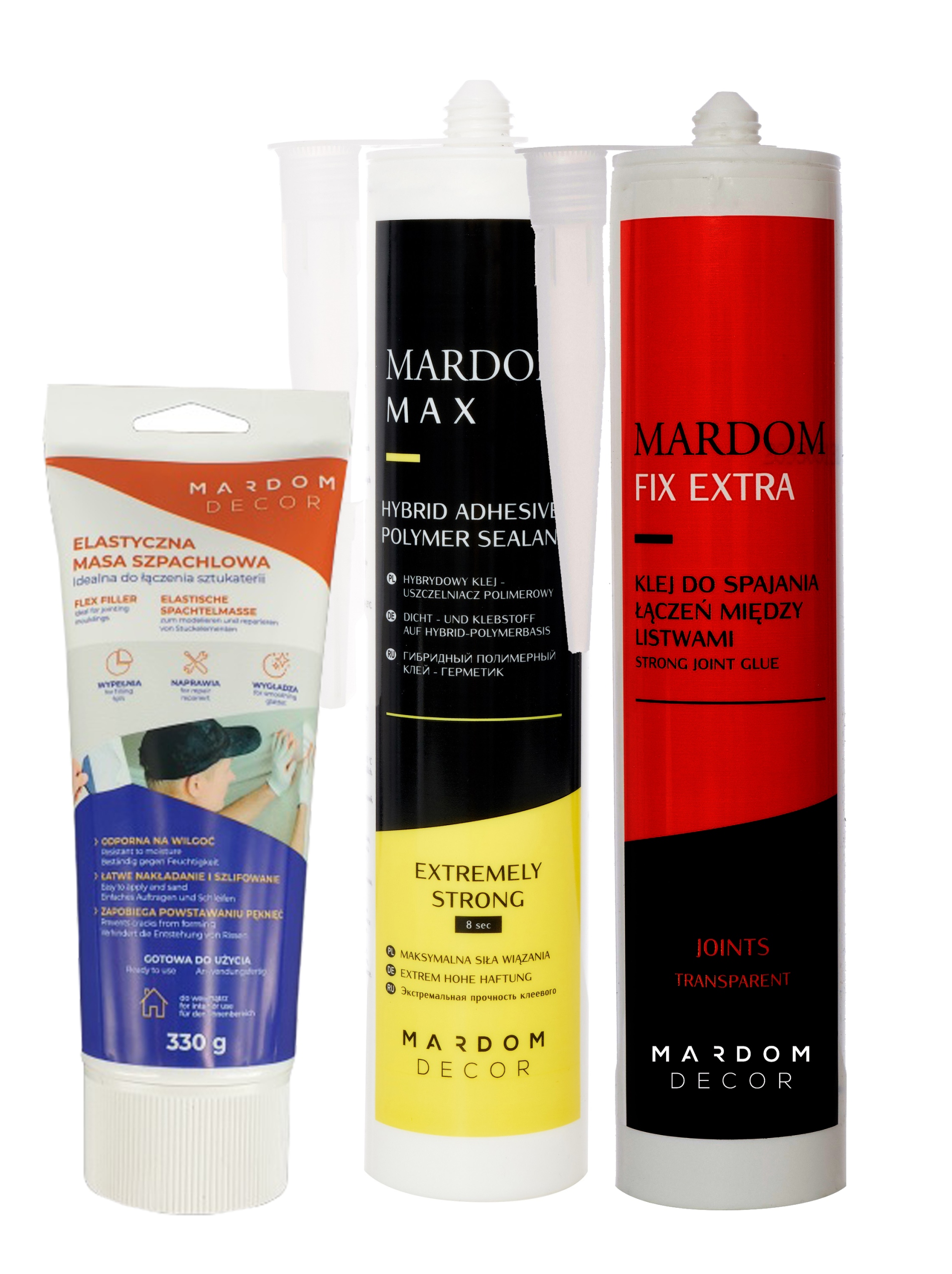 - Для встановлення стрічок карнизів рекомендується використовувати міцний монтажний клей Mardom Max, який швидко реагує на підкладка. Фактичний монтаж передбачає нанесення клею хвилеподібними рухами на верхній край стрічки та притискання до стелі, утримуючи штукатурку кілька секунд, щоб клей схопився. Надлишки клею можна видалити вологою ганчіркою або губкою. Після висихання клей можна відшліфувати дрібним наждачним папером.