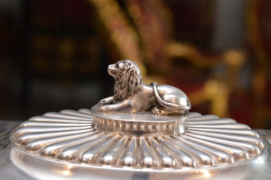 Прекрасна цукорниця 19-го сторіччя типу коробки, що підтримується на чотирьох ніжках у форма лев'ячих лап. Кришку цукорниці увінчує величний охоронець лева – теж зі срібла. Надзвичайно унікальне срібло, всередині збереглася оригінальна позолота.