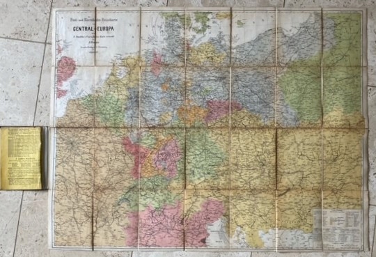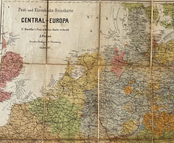Опис: Цікава поштова та залізнична карта Центральної Європи в оригінальній книжковій обкладинці, надрукована Флемінгом у Глогуві