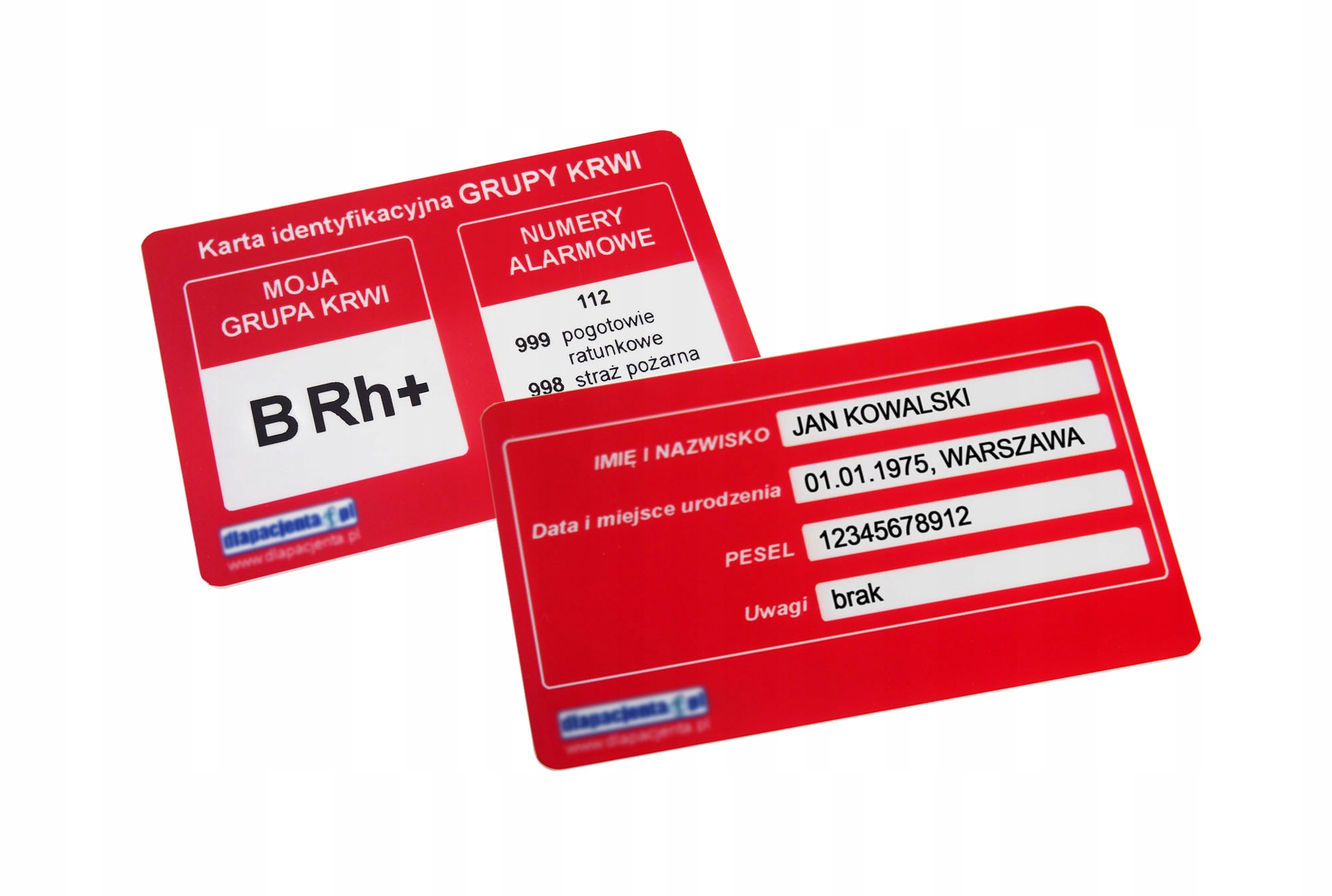 Дякую на цю картку, яку ми носимо, наприклад, у гаманці, ми можемо швидко повідомити рятувальні/медичні служби про нашу групу крові.