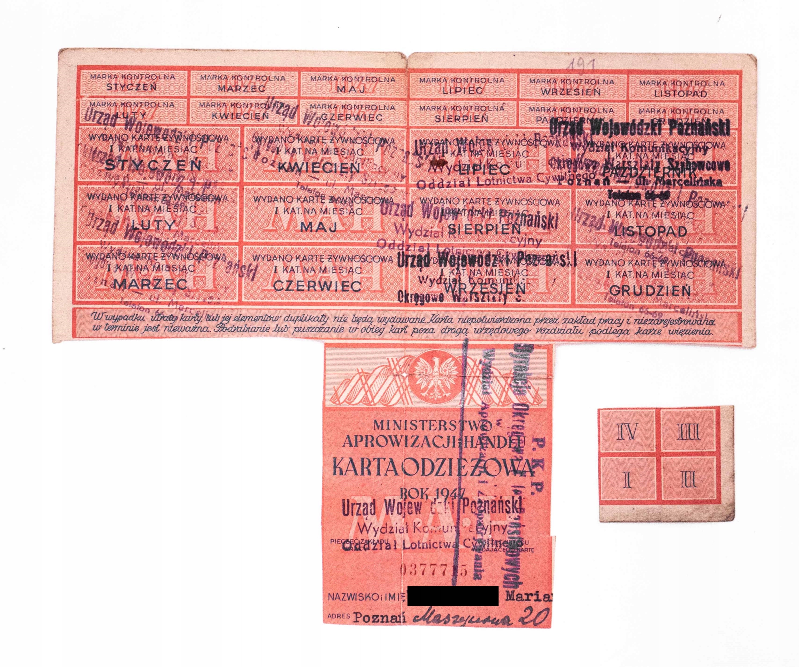 КАРТКА НА ОДЯГ ТА ХАРЧУВАННЯ - PKP, POZNAŃ 1947