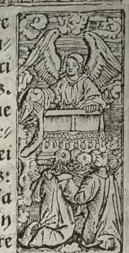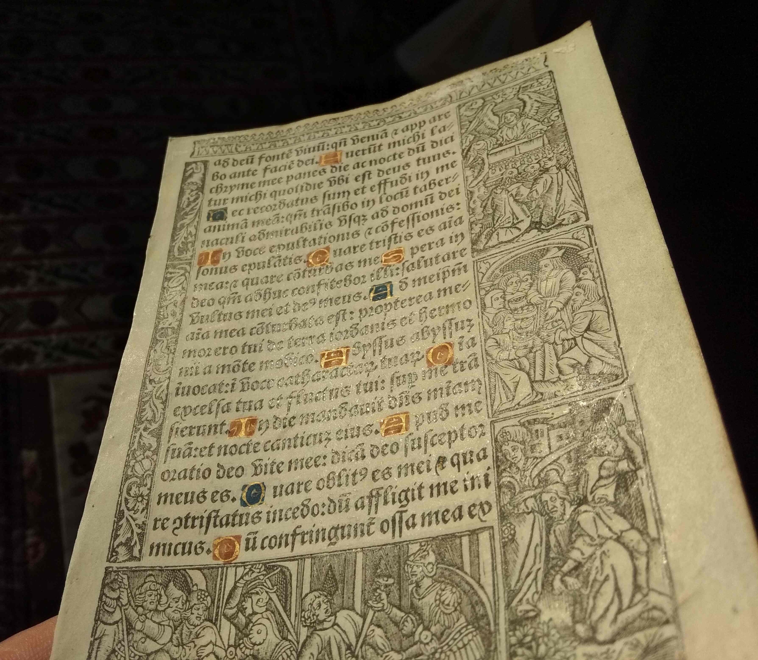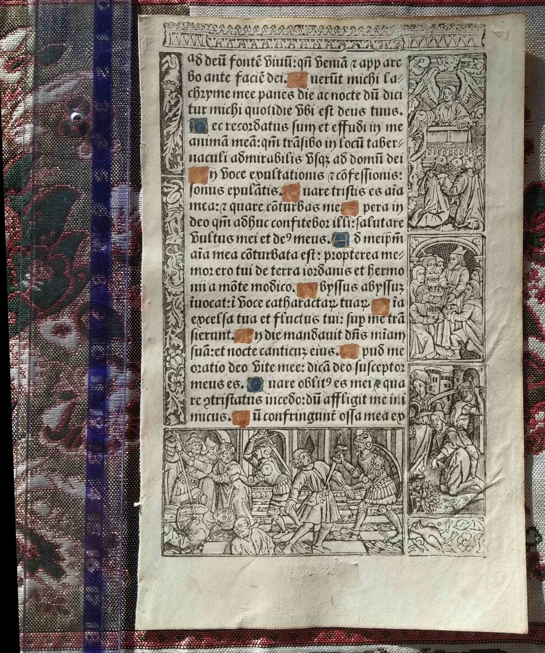 картка пергаменту, що містить фрагмент молитви SO Години, походить приблизно з 1500, з Франції. Він друкується на пергаменті, що зберігається у стилі середньовічного рукопису. Розмір картки прибл. 11 х 17,5 див. Ініціали написані вручну, золото, червону та синю чорнило. Навколо тексту є декоративний бордо, що зображує біблійні сцени. Текст був надрукований традиційним шрифтом, тоді як біблійні сцени та прикраси навколо тексту відбивалися на металевій плитці - це металлор. Книга роботи, глава 17. Нижче наведено читання та переклад фрагмента, починаючи з початкового "S" (шість віршів). Non Peccavi et in