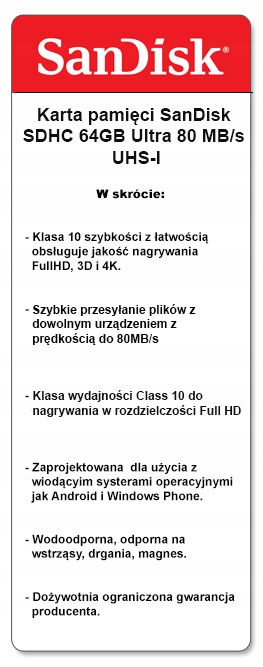 Просматривая «Карта пам’яті (SDXC) 64 ГБ SanDisk Ultra 80 МБ/с U», вы можете быть уверены, что данный товар из каталога «SD» будет доставлен из Польши и проверен на целостность. В цене товара, указанной на сайте, учтена доставка из Польши. Внимание!!! Товары для Евросоюза, согласно законодательству стран Евросоюза, могут отличаться упаковкой или наполнением.