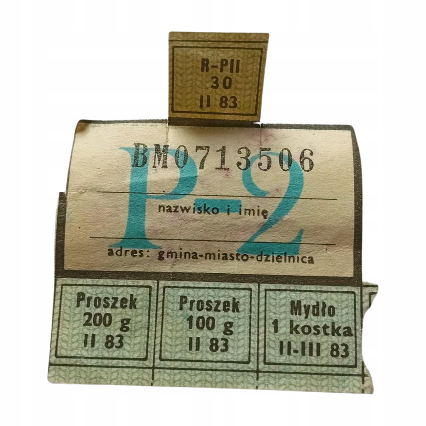 Продам картку неповного постачання часів ПНР тип П-2 за лютий 1982 року. Внизу картки два купони на пральний порошок - на купівлю 100 і 200. г порошку та талон на 1 кусок мила за лютий та березень 1982 р. Вгорі є талон Р-П ІІ 30, нажаль не знаю його призначення. На звороті печатка гмінного управління Козьмінек – воєводство. Каліш. Стан досить хороший - купон зі складками.