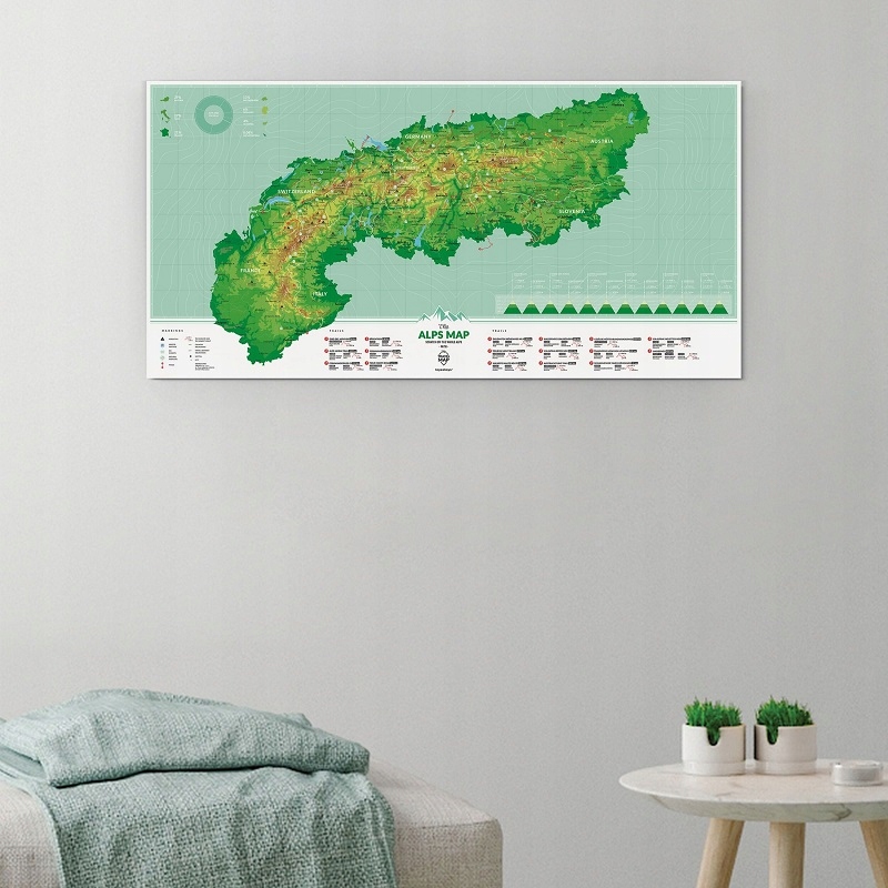 Скретч-карта Альп — це незвичайна карта гірського масиву Альп, захована під срібною скретч-карткою. Феномен скретч-карти передбачає видряпування місць або вершин, які вже були підкорені. Ви також можете нашкребти місце перед поїздкою, щоб побачити, що цікавого в цьому районі. Карта Альп показує найвищі точки Альп, найважливіші маршрути та їх протяжність, найважливіші пам’ятки ЮНЕСКО, найкращі гірськолижні курорти та природні чудеса. Крім того, у верхньому лівому куті є діаграма з відсотками площі Альп в окремих країнах. Унизу праворуч надруковано найважливіші вершини Альп, а також висоту та довжину маршруту та країну, у якій розташована вершина.