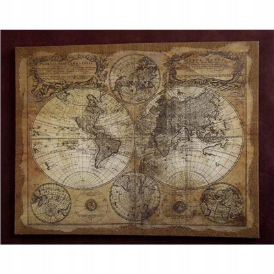 Цікаве прикраса стіни у вінтажному стилі — готова до розвішування картина, натягнута на раму. Стильна настінна прикраса в ретро або вінтажному стилі, карта покликана відсилати до старих вітрильних завоювань і показує Старий Світ.Виготовлена у вінтажній техніці, злегка натерта і засмагла, виглядає так, ніби її знайшли в старому стовбурі.