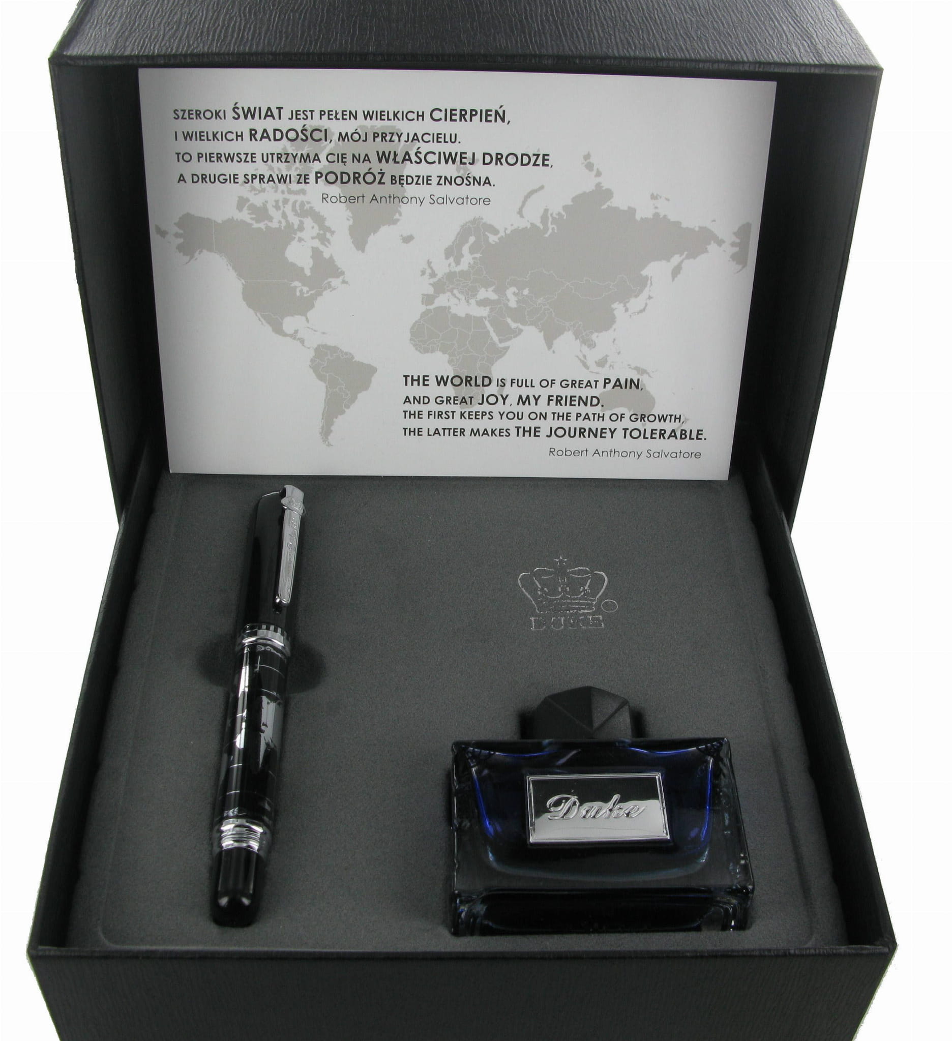 Duke 669 World з лакованої латуні з малюнком карти світу. Коронка шапки прикрашена перламутром, закручується з двох сторін. Хромована обробка. Екологічно чистий чохол із чорнилом Duke. На кришці вкладиш із картою світу та цитатою. Перова ручка оснащена системою наповнення конвертера, яку можна замінити картриджами з чорнилом.