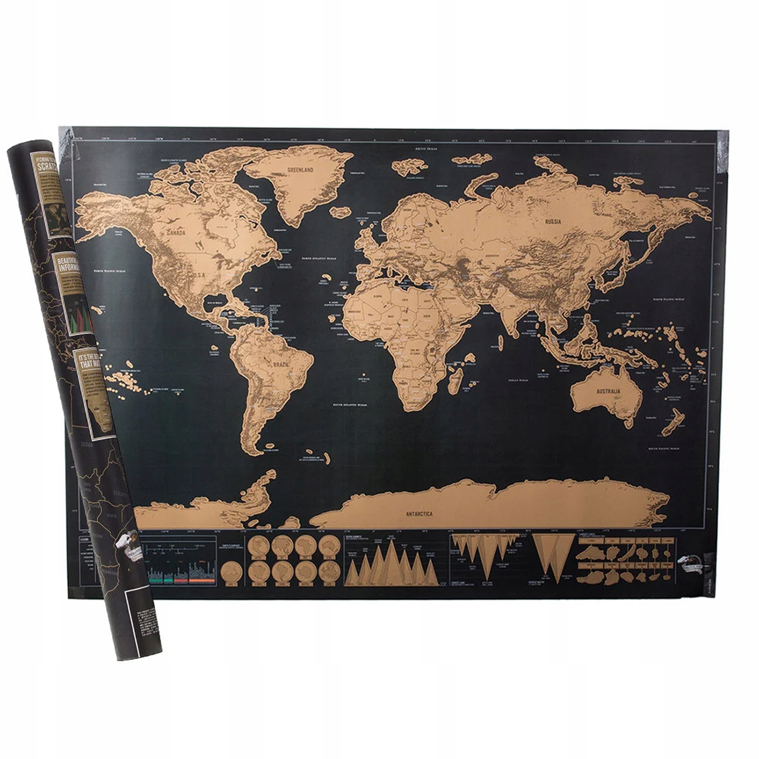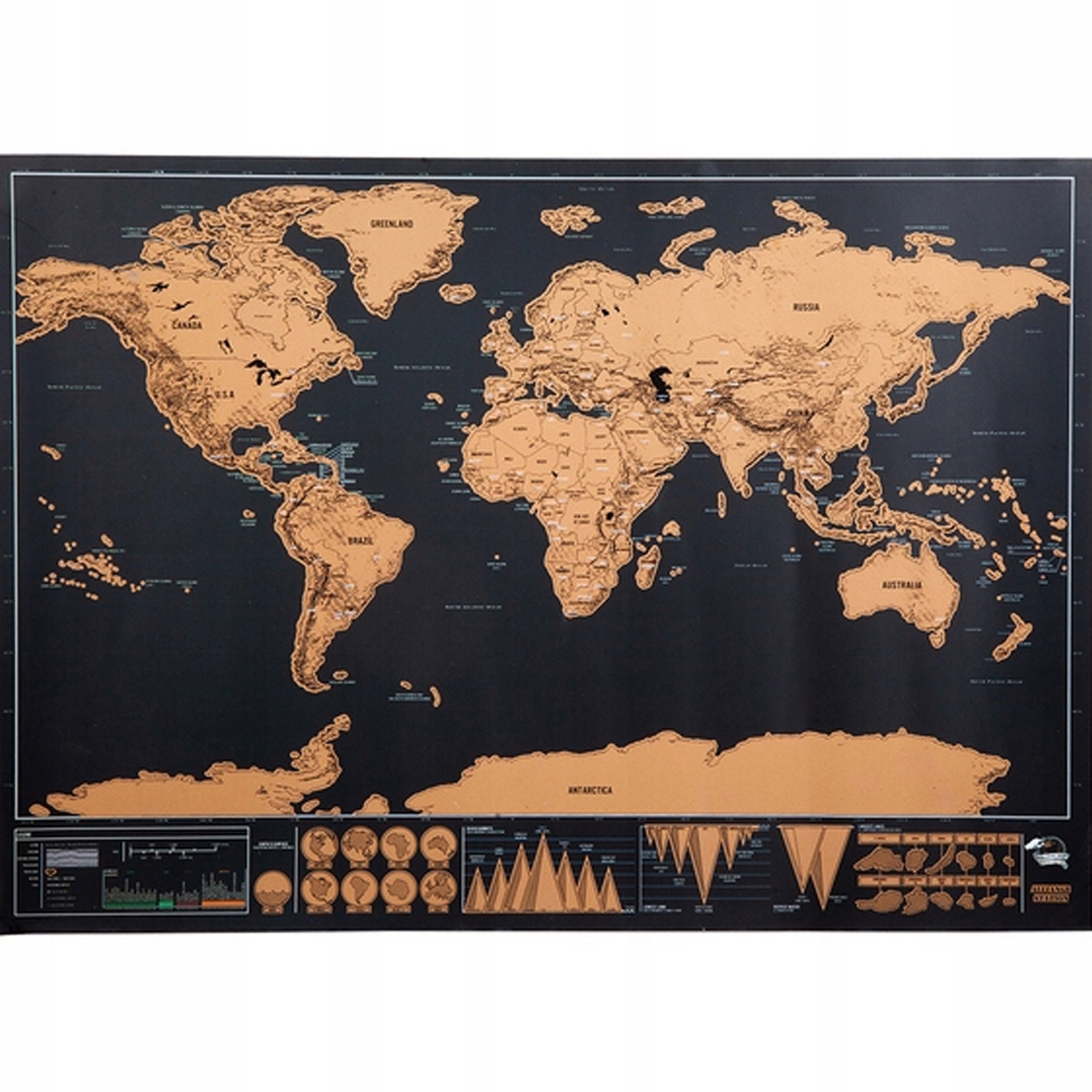 Стирана карта світу — ідеальний гаджет для кожного мандрівника. виріб виконано класично, колір чорний, пов'язаний з злотим. Кожна країна та континент покриті алюмінієвою фольгою, що зішкрябується.Фольга має однорідний колір, але при подряпуванні можна буде побачити різні відтінки та чіткі контури окремих країн.