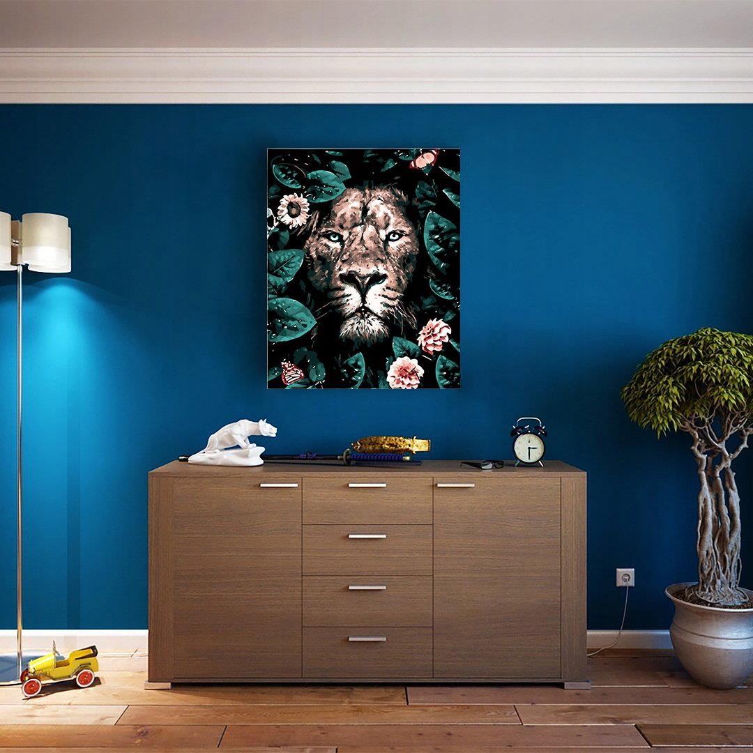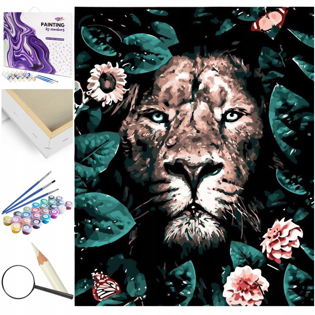 ПРИМІТКА: На цьому аукціоні продається набір малюнків за номерами «Лев у квітах» розміром 50x40 см НА РЕМЕНІ.