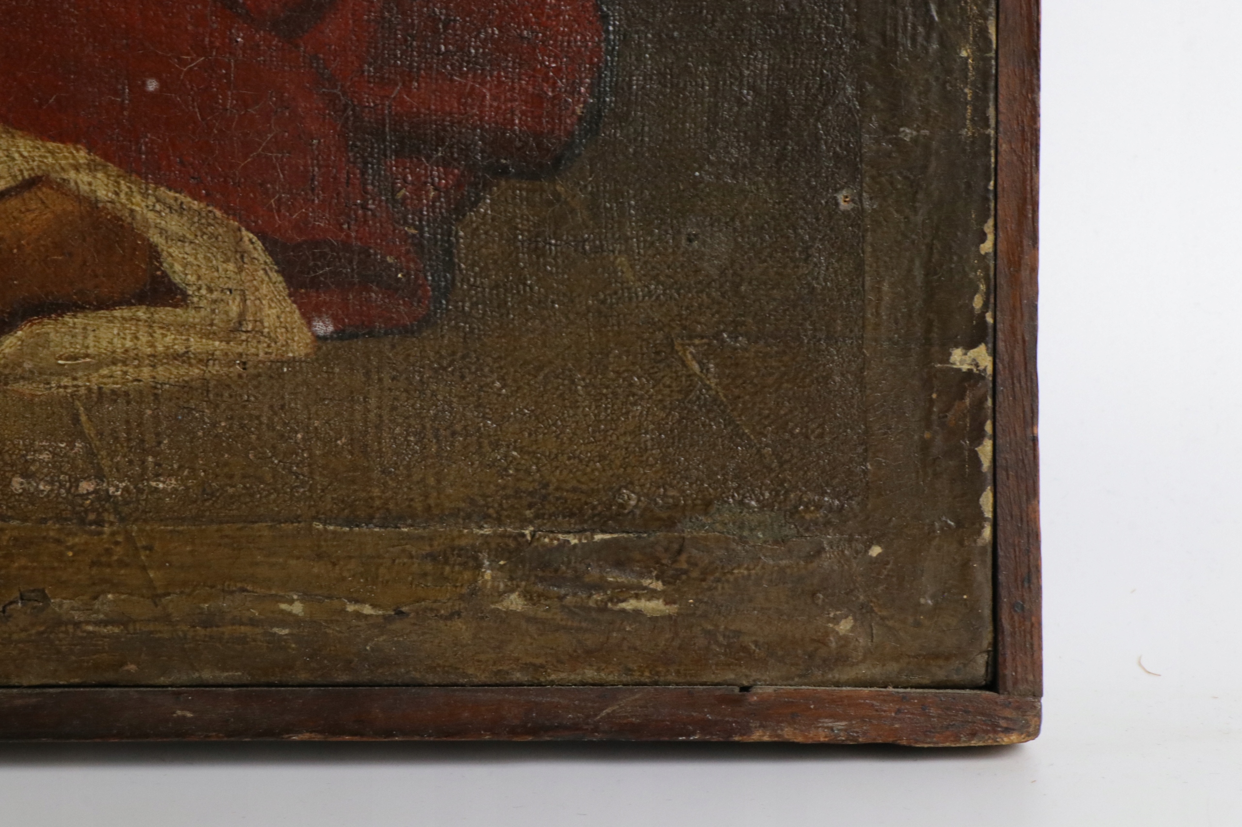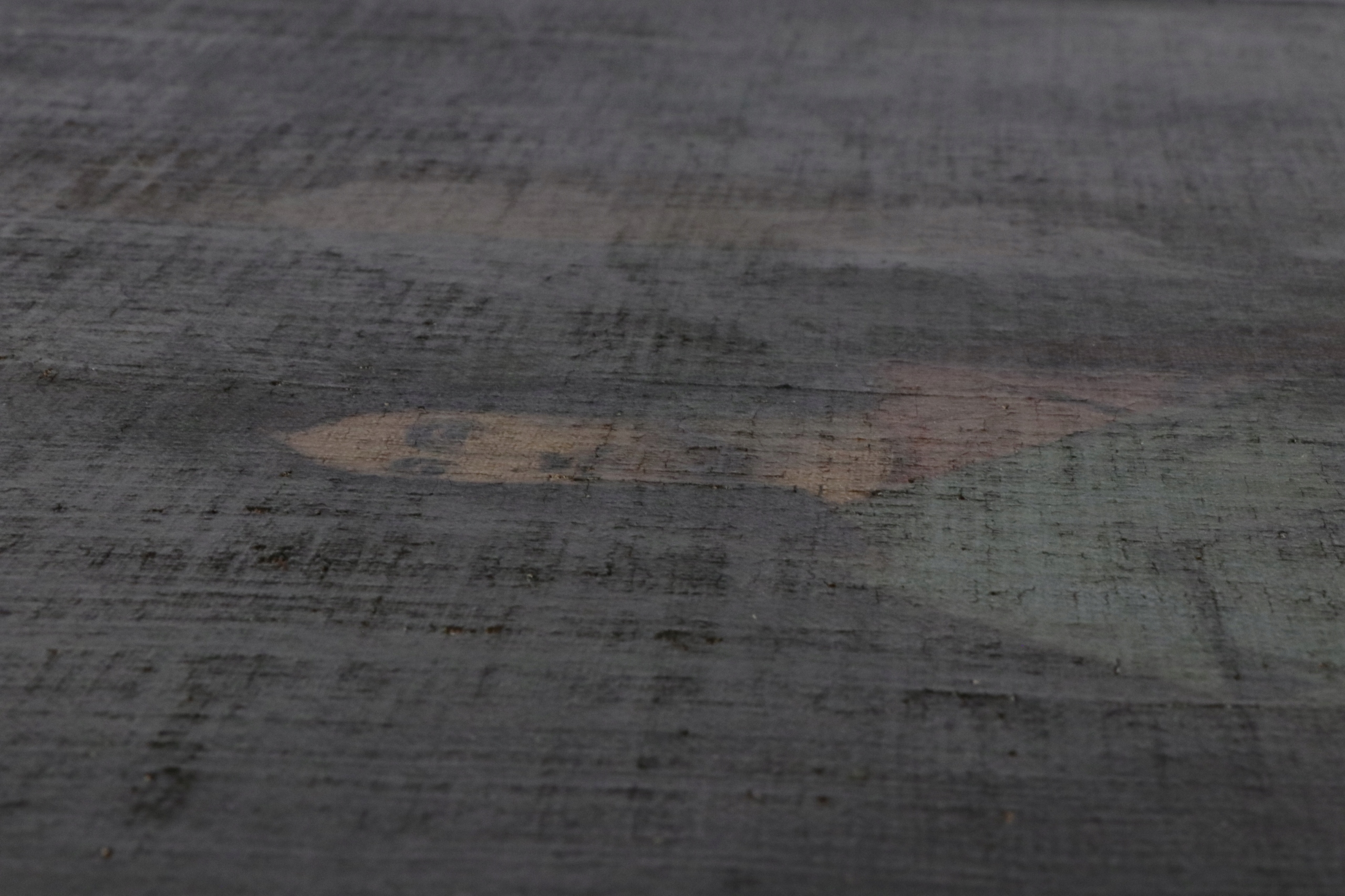 Зображення дуже затемнене, потребує догляду та чищення. У кількох місцях видно невеликі дефекти фарби, просвічується полотно. Картина без сліз.