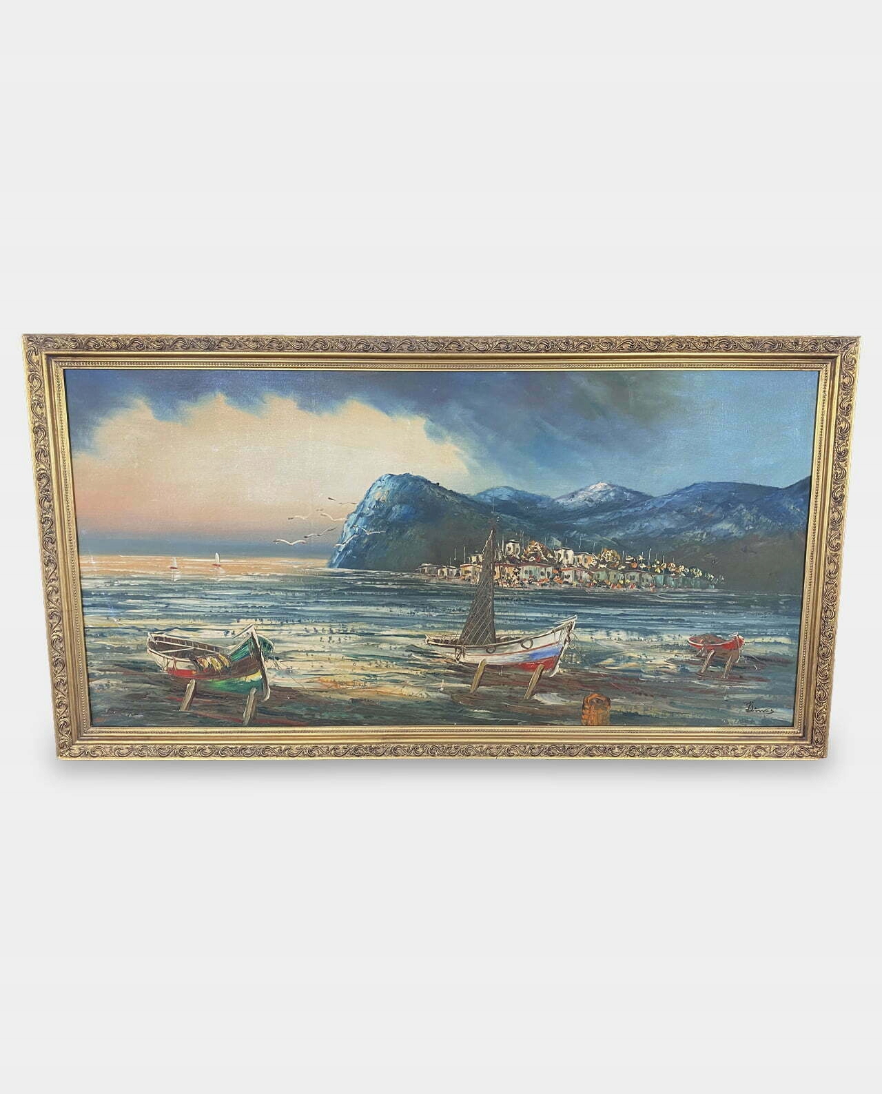 Класичне велике полотно в золотій рамі, написане олією, на якому зображено світло призахідного сонця, яке падає на морський порт із кораблями та містом на задньому плані. Красиве та атмосферне дослідження природи з меланхолійним виразом. Оригінальний сюжет на полотні вирізняється неймовірною глибиною кольорів та оригінальною манерою живопису. Він оформлений у багато декоровану та позолочену раму. Прикраса для вітальні, кухні або кабінету. Все це справляє чудове естетичне враження та має позачасовий стиль. Підходить для багатьох інтер'єрів. Чудовий подарунок для любителя моря чи мистецтва.