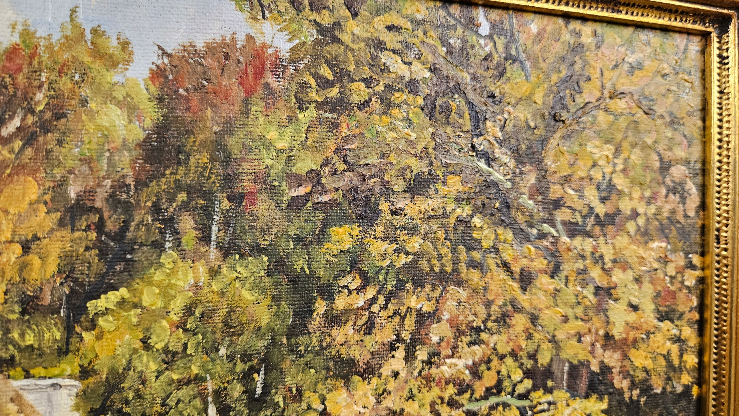 Предметом аукціону є оригінальна картина маслом із зображенням осіннього пейзажу з традиційною солом’яною хатою в оточенні дерев у повній золотої осені. На площі перед будинком ви можете побачити людей, які сидять і бенкетують, що надає роботі життя та автентичної, ідилічної атмосфери. Композиція картини в теплих тонах ідеально відображає атмосферу скандинавської сільської місцевості.