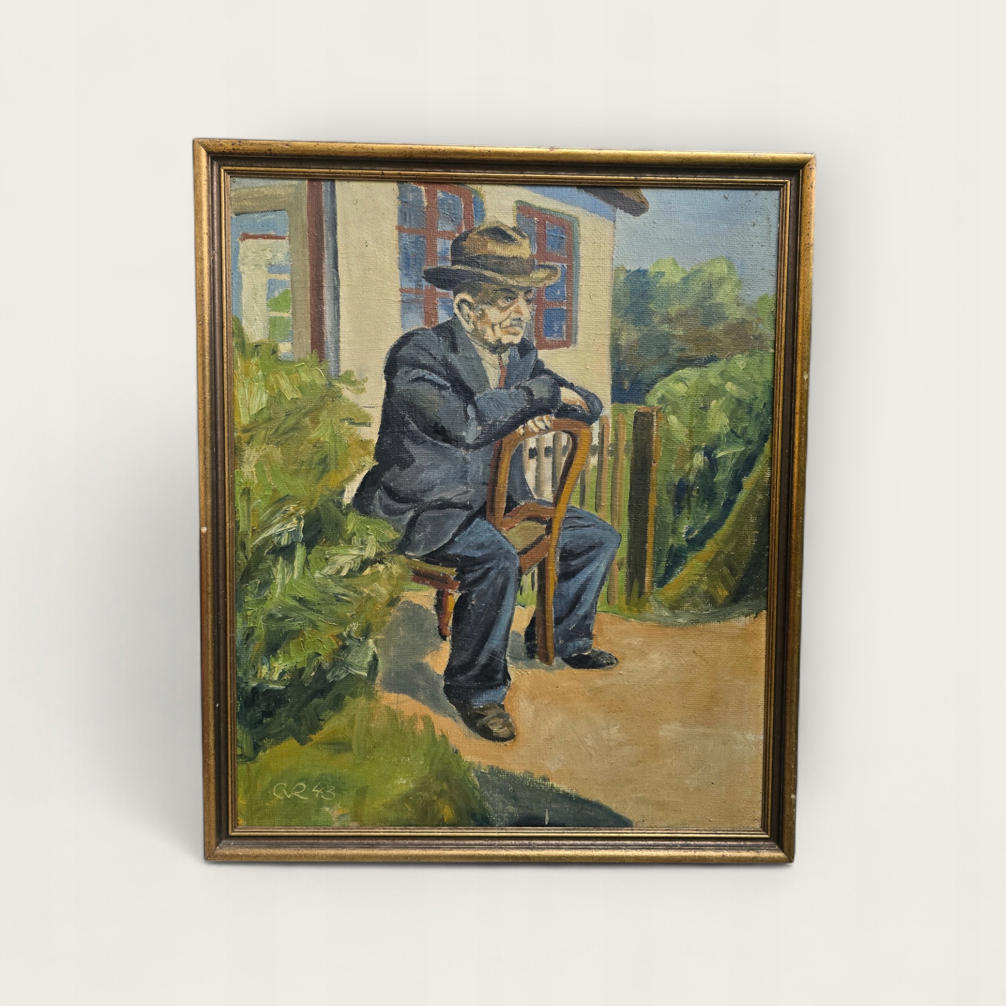 Представляємо вашій увазі унікальну олійну картину, написану на полотні в 1943 році, підписану монограмою "CVR". Твір характеризується виразною, експресивною манерою живопису, з видимою фактурою фарби, яка надає їй глибини та динаміки. На картині зображений чоловік, який сидить у капелюсі та костюмі, спираючись на стілець, в ідилічній обстановці саду чи двору. Обличчя фігури сповнене роздумів і спокою, що надає портрету інтимного, особистого характеру.
