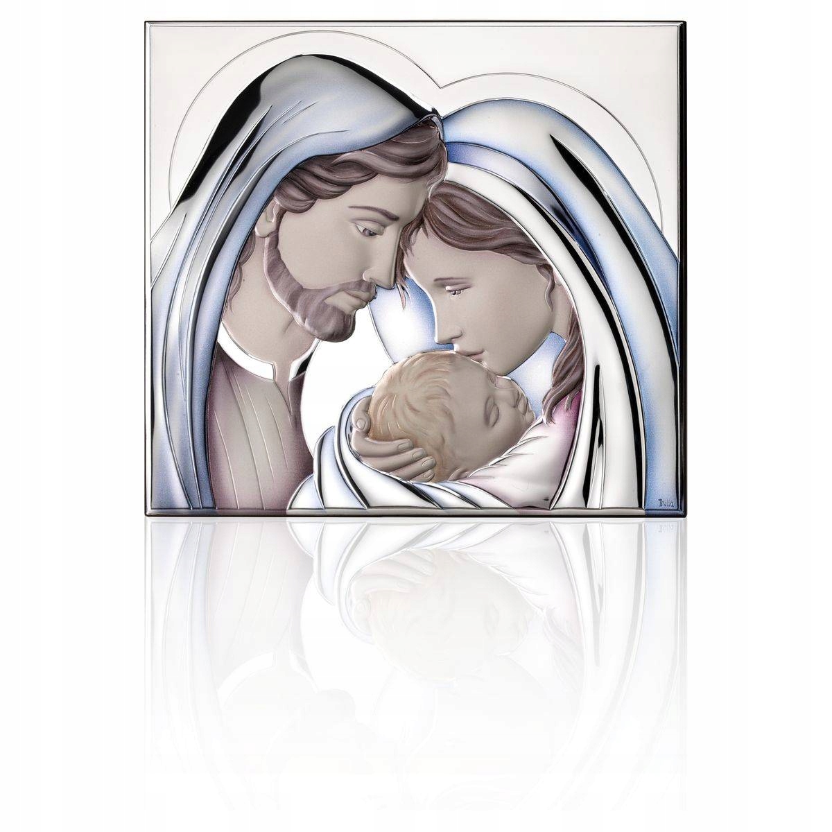 Срібна картина у формі прямокутника із зображенням св. Сім'я виготовлена за технологією посріблення- посріблення. Шар срібла наноситься на поверхню за допомогою атомарного процесуPVD-фізичного осадження з парової фази. Зовнішній шар додатково захищений захисним лаком. Завдяки цьому отримана поверхня стійка до механічних деформацій і потьмяніння і відмінно відбиває світло, що підкреслює шляхетність срібла. .