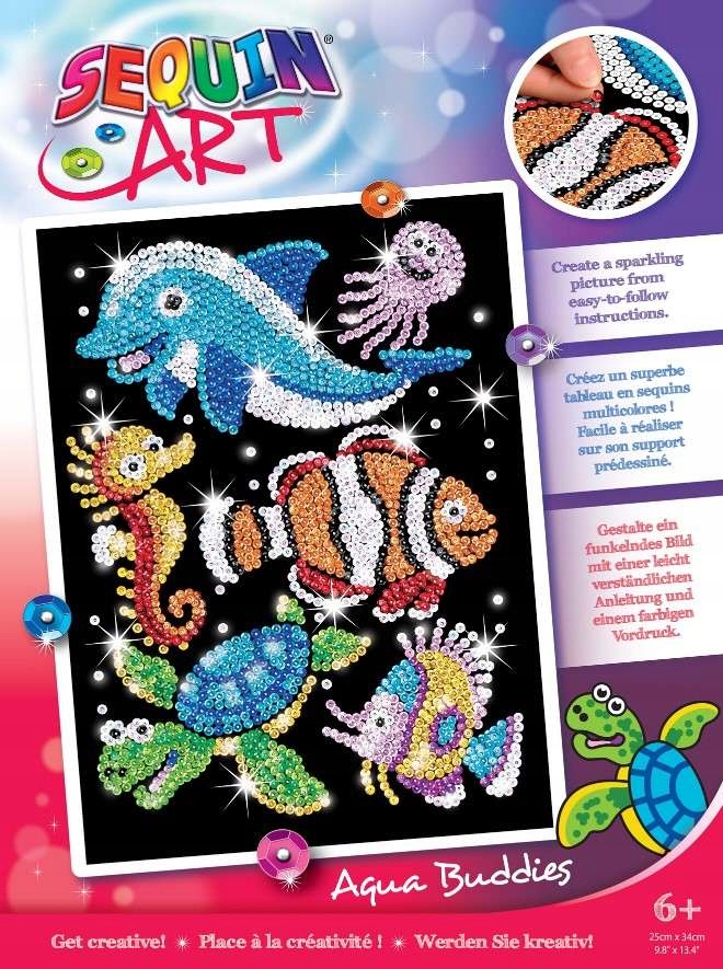 Sequin Art Aquatic Animals Aqua Buddies це творчий набір для створення барвистого витвору мистецтва з блискітками. На ньому представлені веселі підводні істоти: дельфін, восьминіг, черепаха, морський коник та інші рибки. Для його виготовлення не потрібно володіти винятковими художніми здібностями. Покладіть кольорову картинку на блок, що додається, і за допомогою шпильок розмістіть паєтки у визначених місцях. Готову роботу можна повісити на стіну, щоб створити цікаву прикрасу, наприклад, для дитячої кімнати.