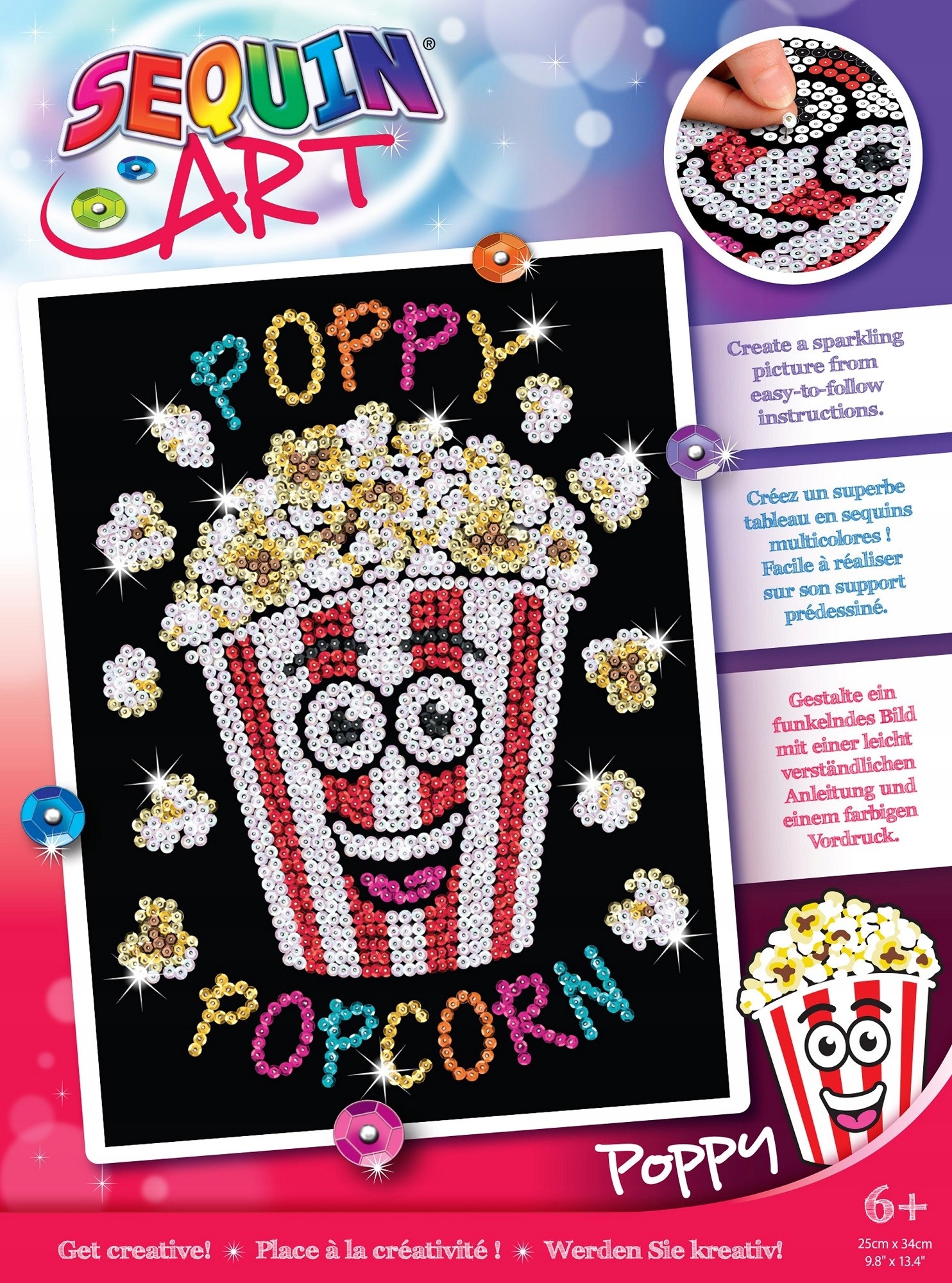 Sequin Art Popcorn Poppy це творчий набір для створення барвистого витвору мистецтва з блискітками. На ньому зображено веселе кінематографічне відерце попкорну на чорному тлі. Для його виготовлення не потрібно володіти винятковими художніми здібностями. Покладіть кольорову картинку на блок, що додається, і за допомогою шпильок розмістіть паєтки у визначених місцях. Готову роботу можна повісити на стіну, щоб створити цікаву прикрасу, наприклад, для дитячої кімнати.