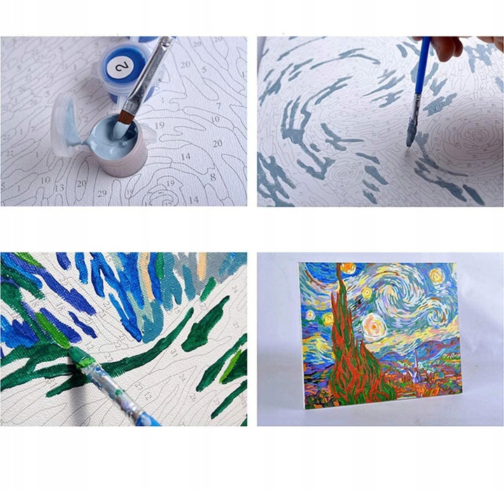 - Номери на полотні відповідають номерам фарб. Використовуйте однакові номери кольорів фарби для однакових номерів кольорів на полотні.