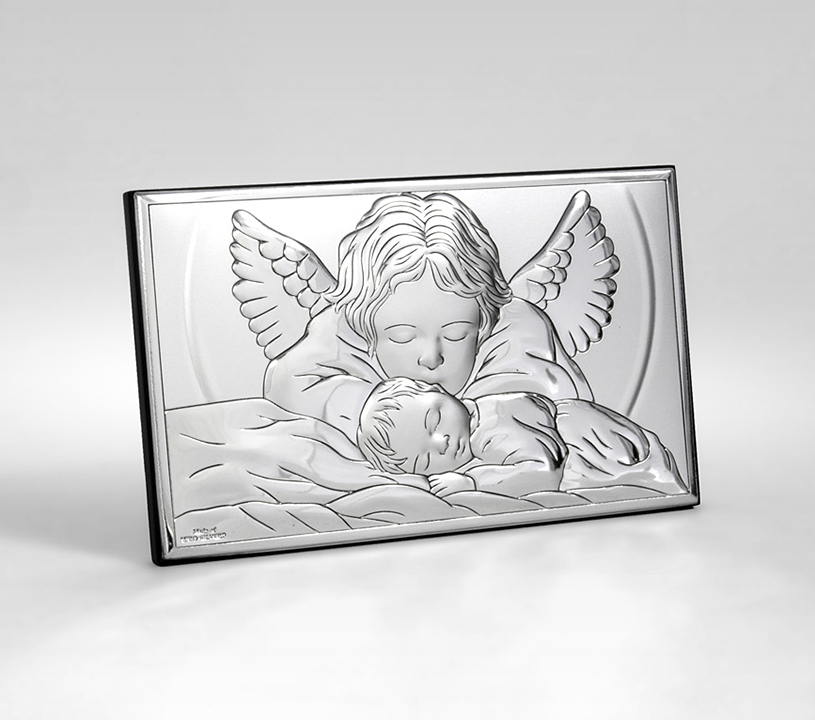 Срібна картина для хрещення із зображенням зображення ангела-охоронця, що схилився над сплячою дитиною. Ідеальний сувенір на хрещення чи день народження малюка.