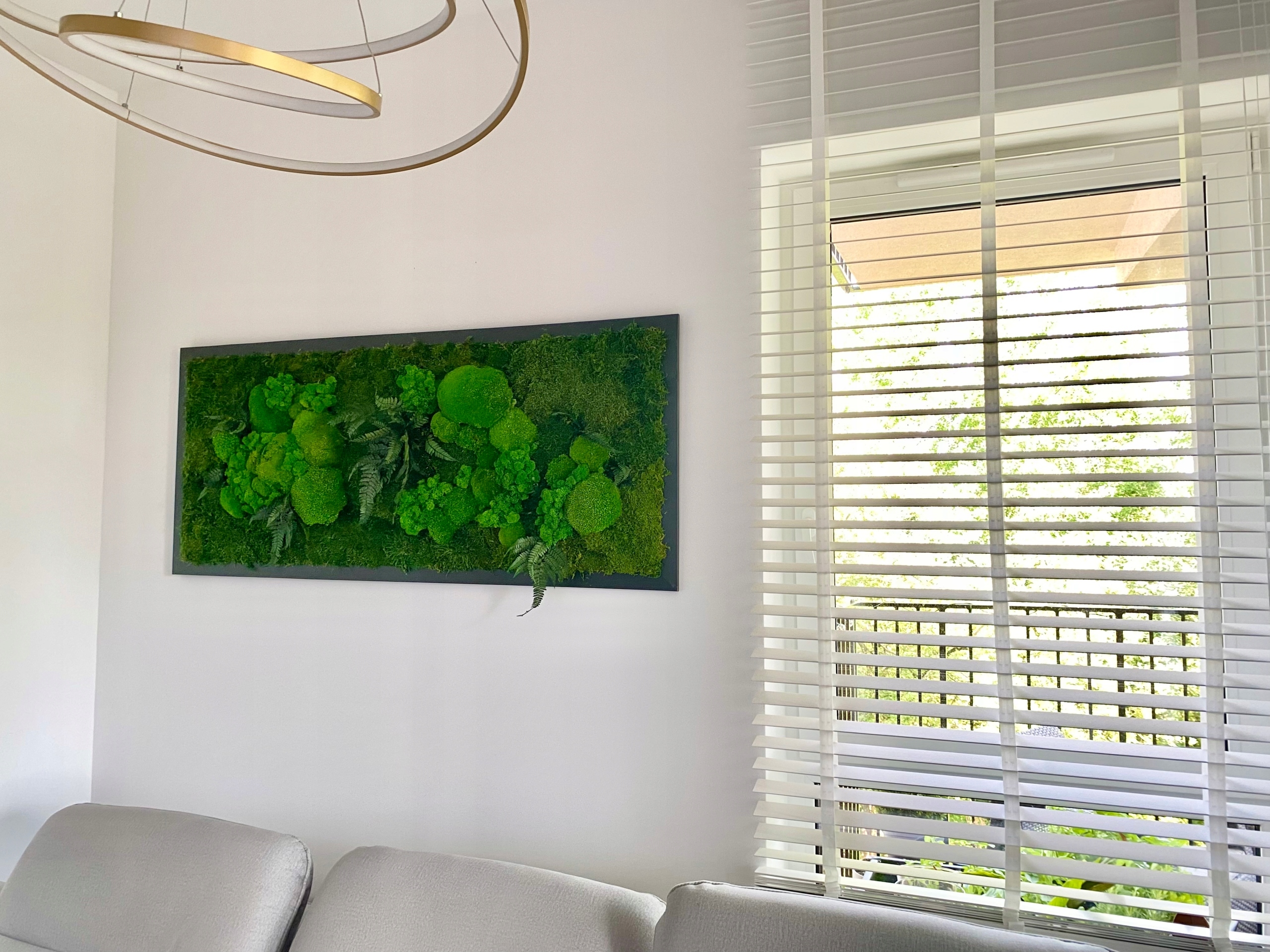 Картина виконана з плоского моху, подушкоподібного моху та стабілізованої папороті.