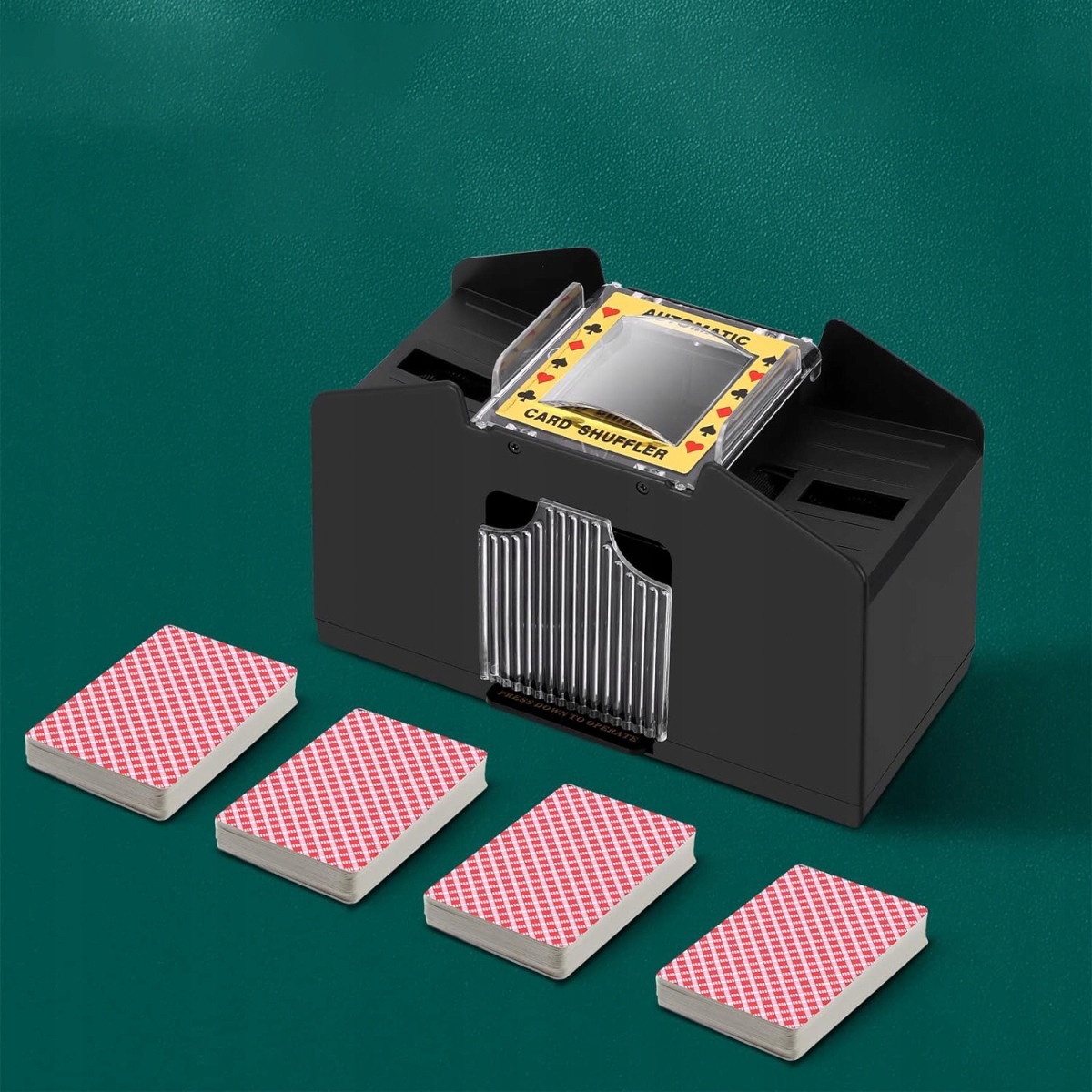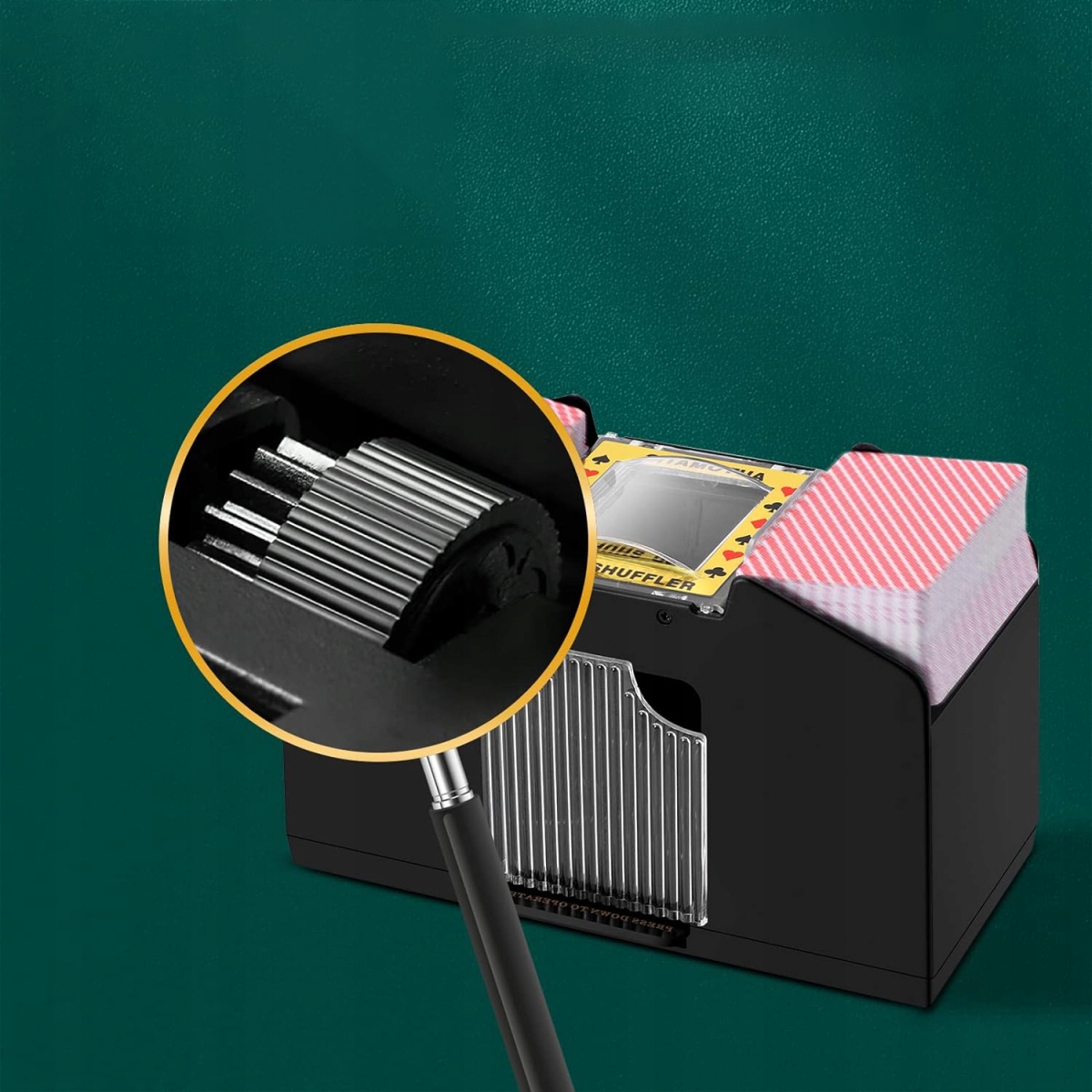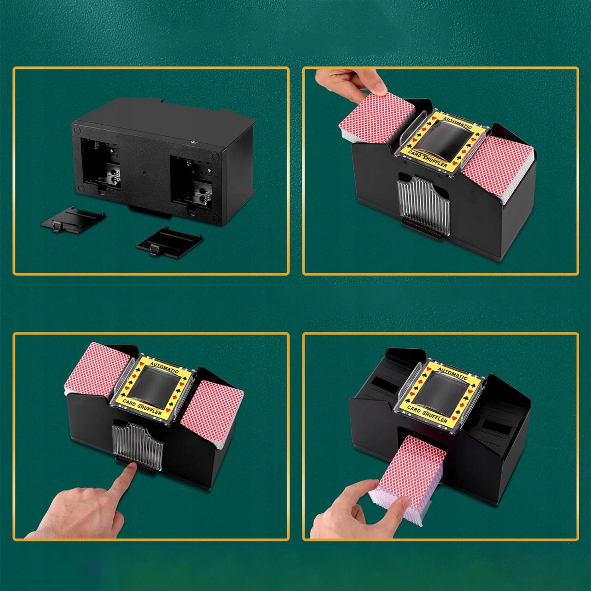 Автоматичний змішувач карт живиться від 4 C батарей (не включається) /USB (не підходить для повторної зарядки, він вимагає підключення до USB -кабелю) , з однією кнопкою, що простевіше, а менш працююче, ніж ручне змішування. Ви можете покласти картки в сітку, і вони будуть змішані з однієї сітки і будуть змішуватися автоматично після натискання кнопки. Це дуже просто і зручно використовувати.