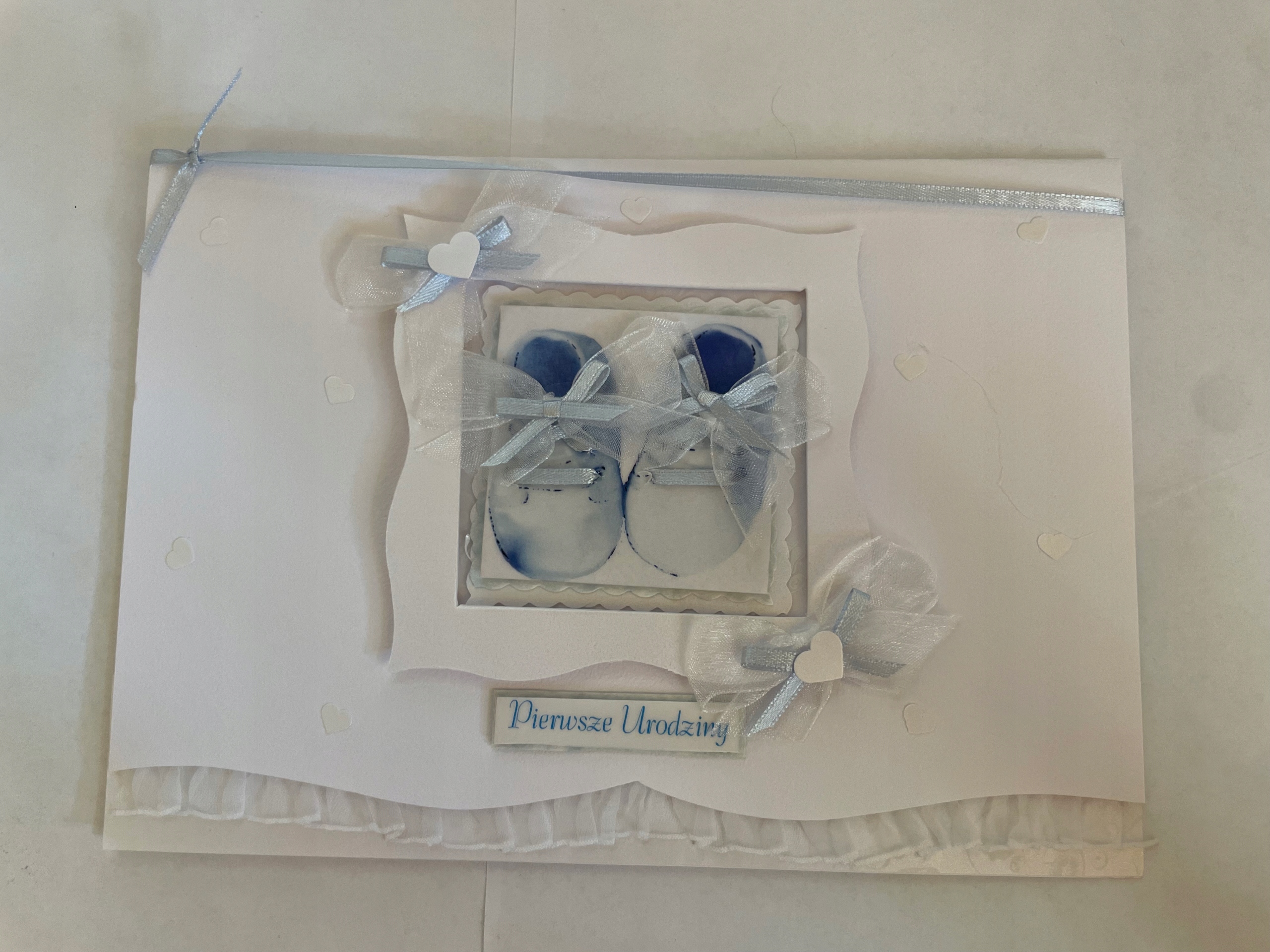 2. Картка ручної роботи на перший день народження - біла з синіми черевиками