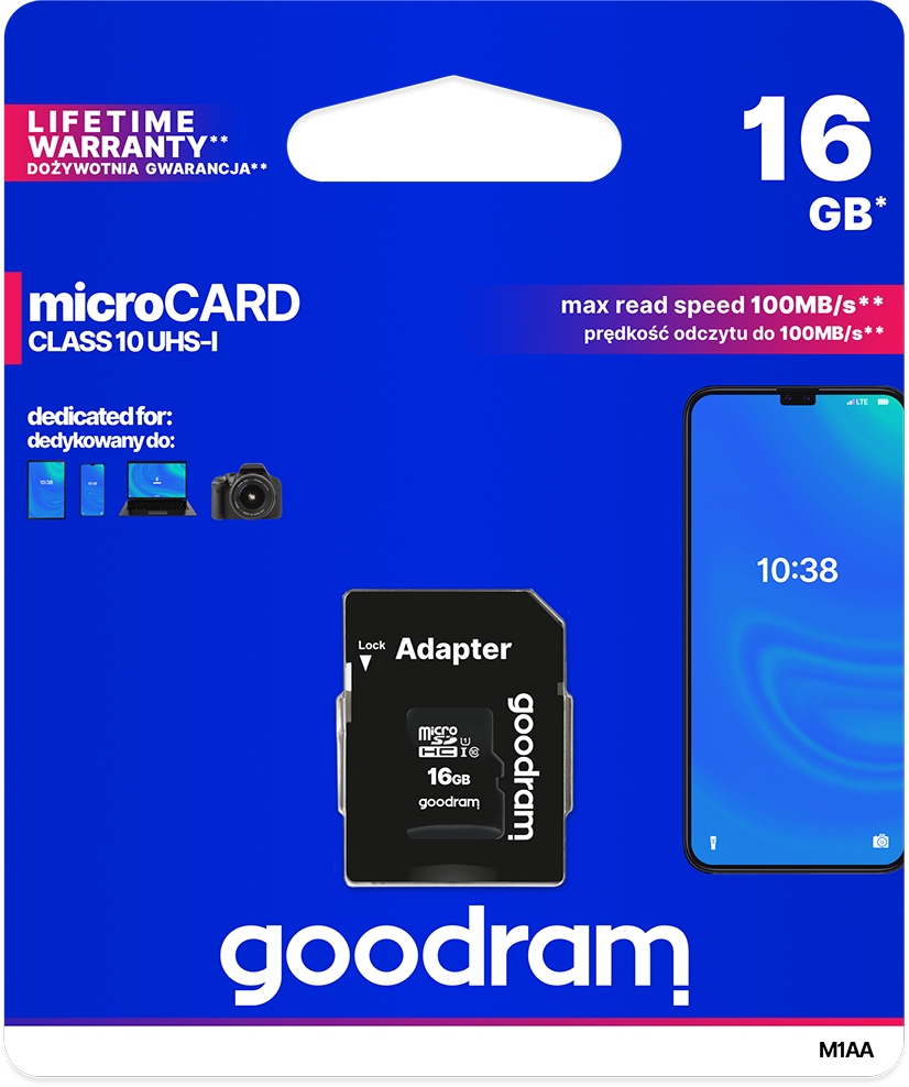 Карта пам’яті GOODRAM microSDHC забезпечує швидкість Class 10 UHS-I. Швидкість читання цієї карти досягає 100 МБ/с залежно від пристрою, в якому вона використовується. Він ідеально підходить для найсучасніших пристроїв.