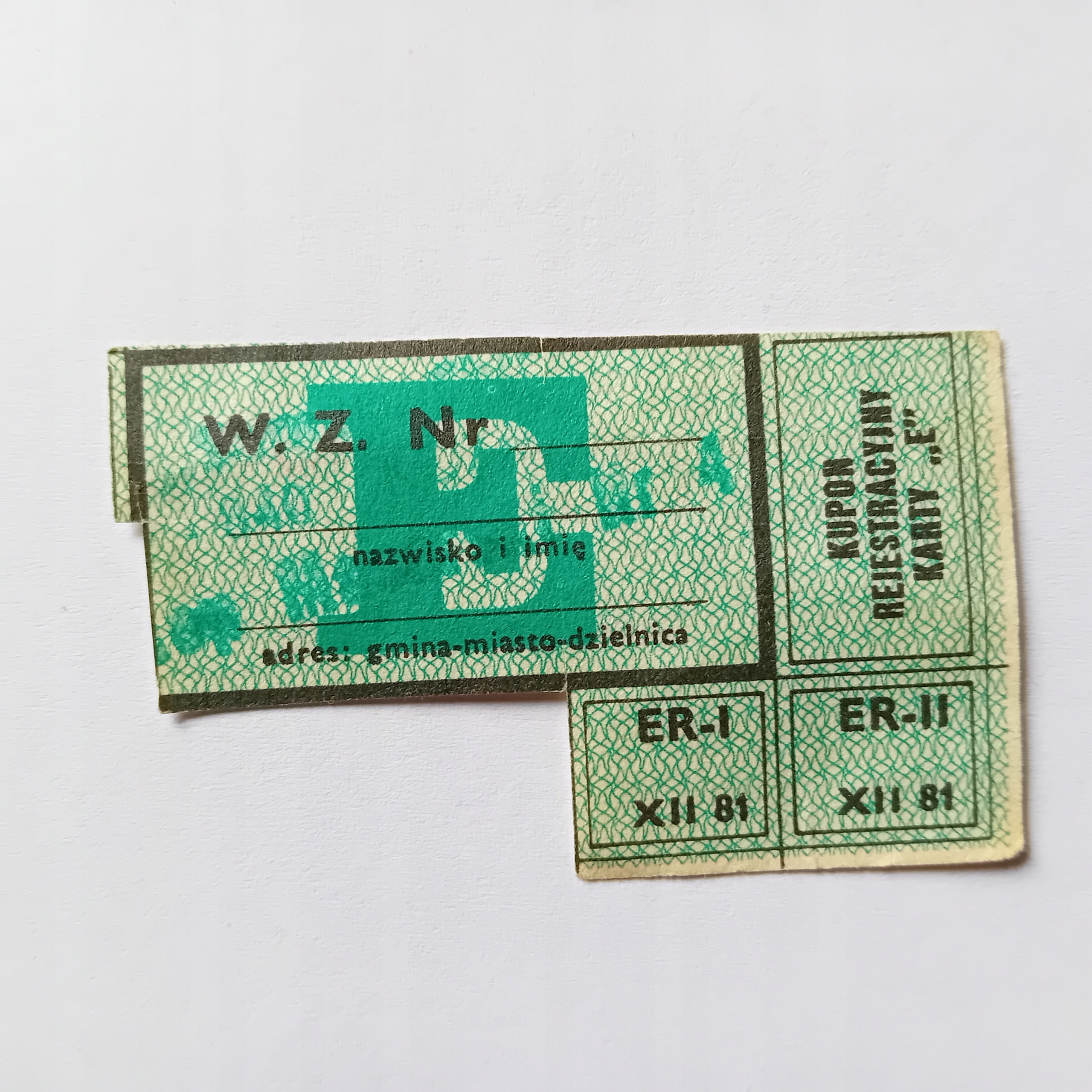 Kartka żywnościowa E grudzień 1981. Oryginał z pieczątką