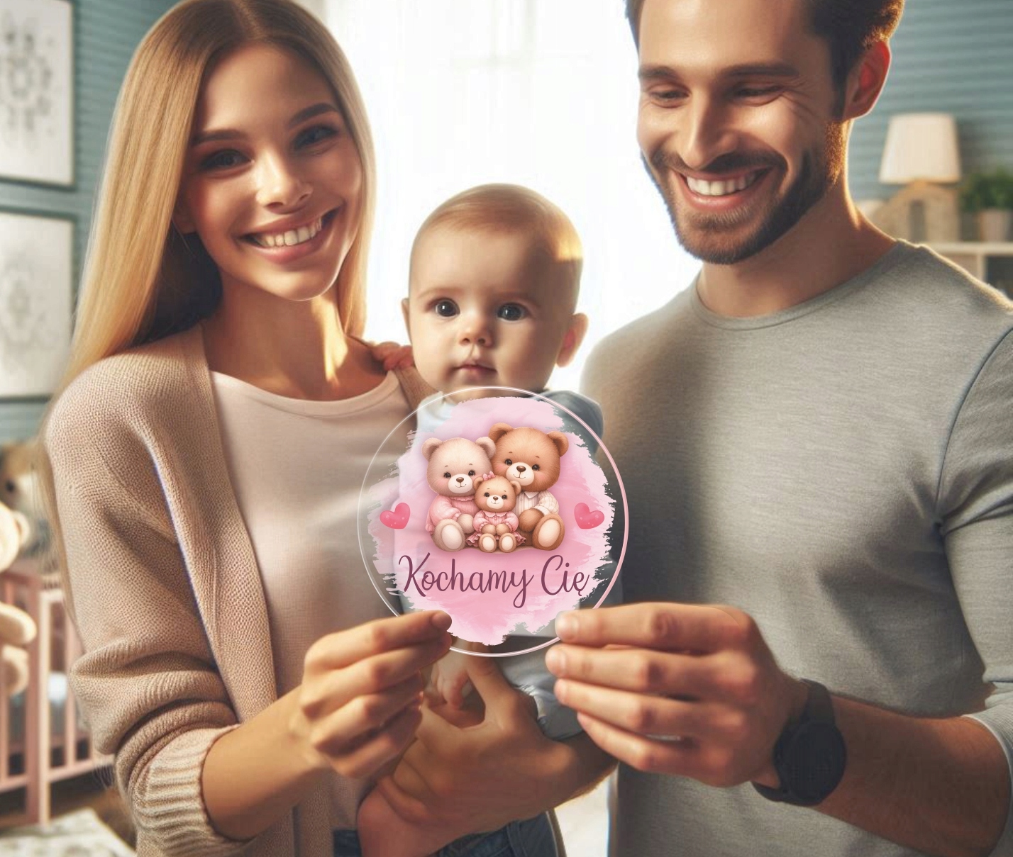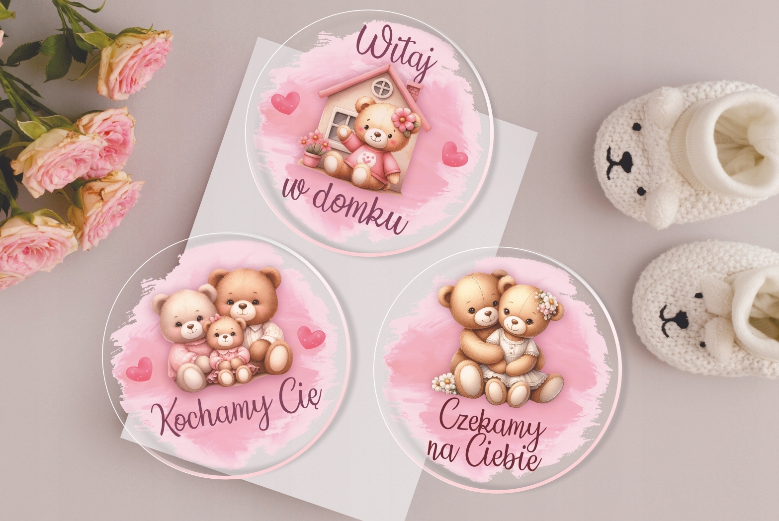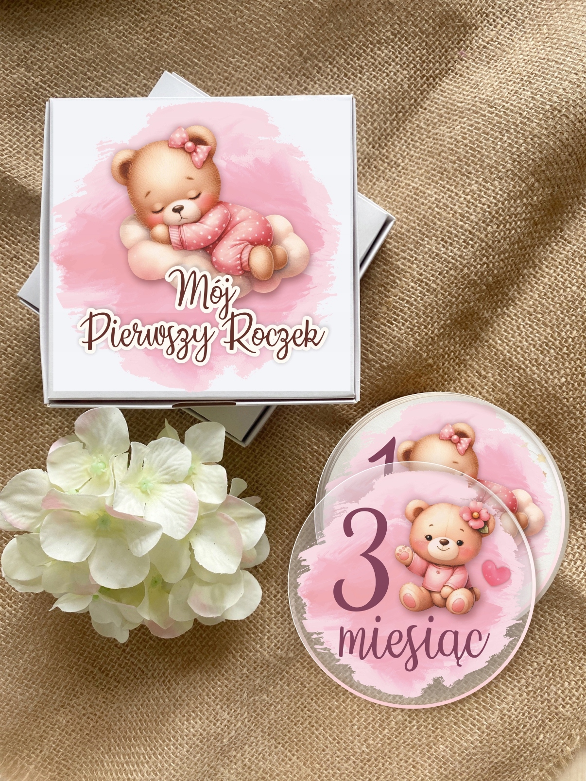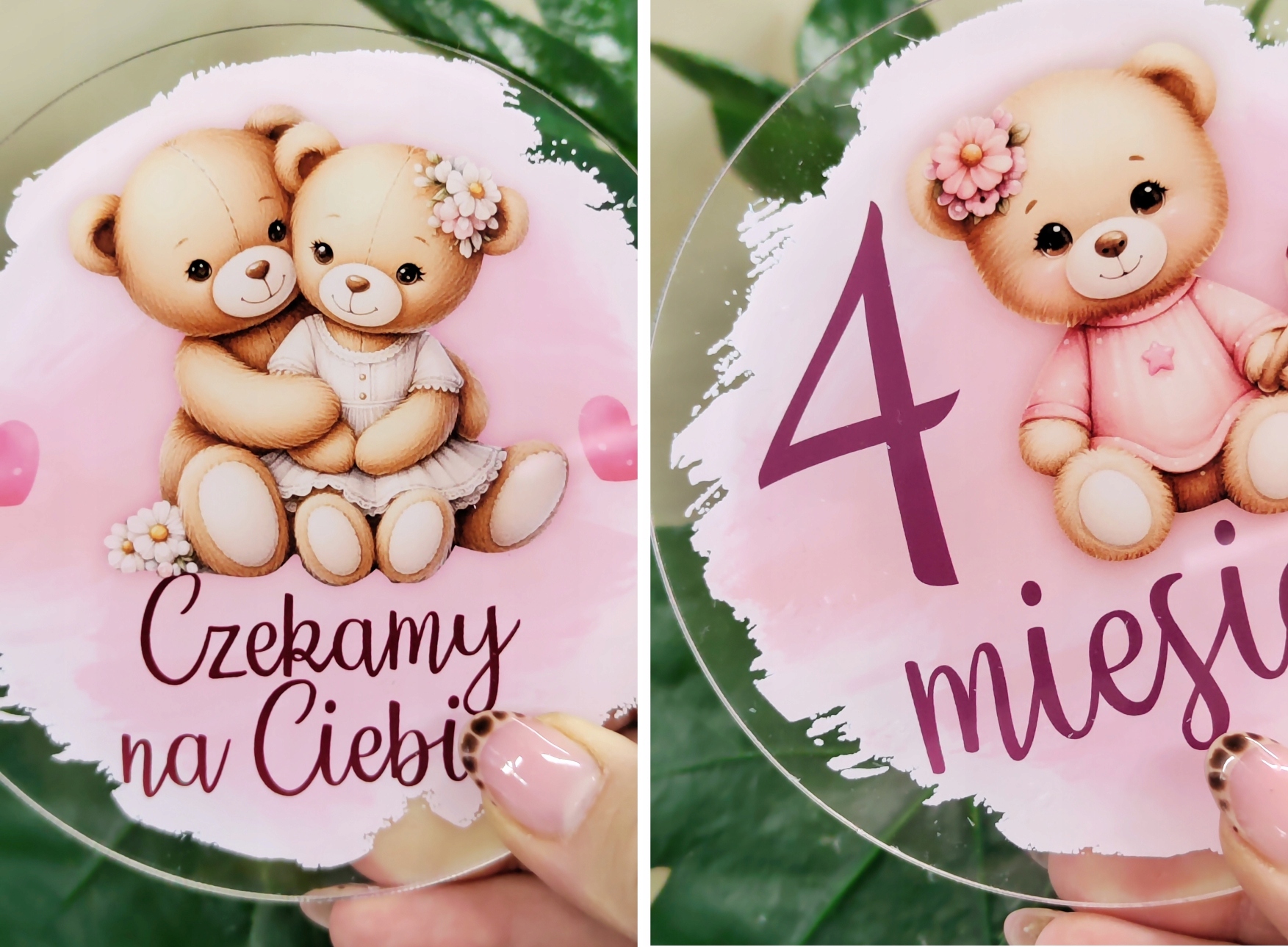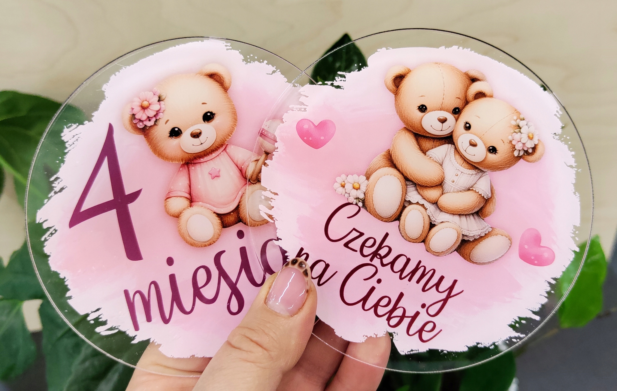 Набір з 16 великих круглих прозорих фотопано з оргскла, упакованих в елегантну білу коробку з принтом, стане ідеальним подарунком для майбутніх батьків. У набір входить листівка з іменем дитини.