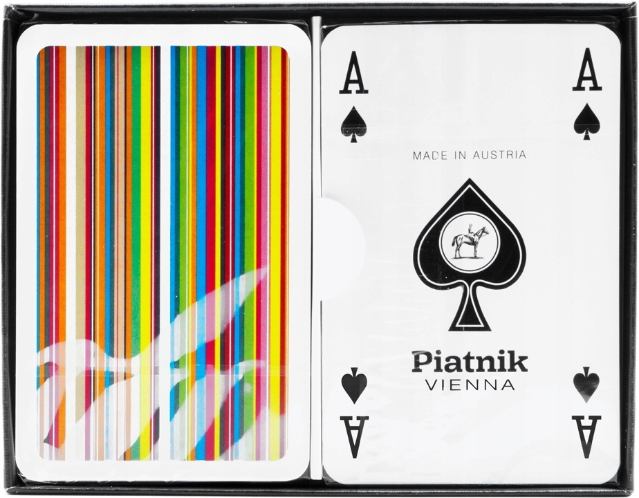 У привабливій коробці Piatnikov 2 колоди, що складаються з 55 пластикових карток розміром 58 x 89 мм і вагою 310. Ідеально підходить для бриджу, покеру, рамі та інших ігор.