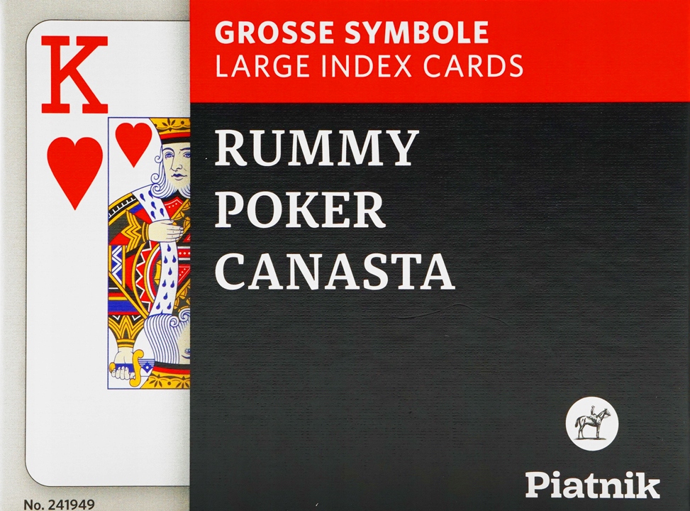 Покерні карти найвищої якості. Збільшені індекси на аверсі. Для ігор за участю глядачів і для людей з вадами зору. В елегантній коробці 2 колоди по 55 пластикових карток розміром 63х88 мм і вагою 310.