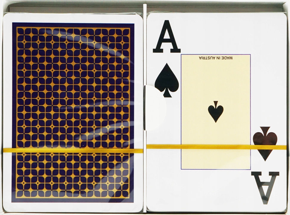Покерні карти найвищої якості. Збільшені індекси на аверсі. Для ігор за участю глядачів і для людей з вадами зору. В елегантній коробці 2 колоди по 55 пластикових карток розміром 63х88 мм і вагою 310.