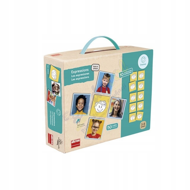 Експресійна гра для дітей віком від 3 до 6 років, яка розвиває здатність розпізнавати вираз обличчя від символів та асоціювати їх із фотографіями реального вираження. Містить 50 сторінок з розмірами 9 х 9 см, виготовленим з товстої та компактної картону. Відмінна забава, що підтримує психічний розвиток дітей шляхом виявлення, групування та класифікації персонажів, пов’язаних з емоціями.