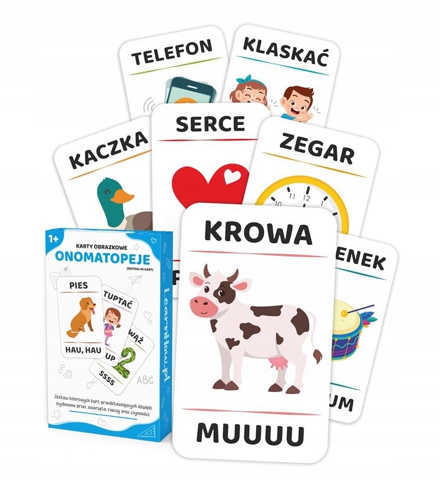 У наборі цілих 45 кольорових карток з назвами тварин, речей і занять, а також звукоподражальними словами, пов'язаними з ними!