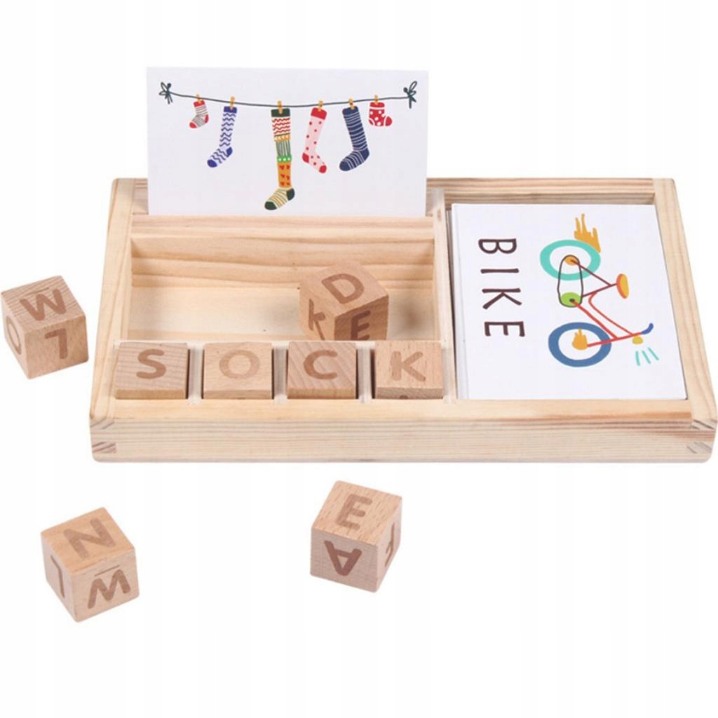 Містить 30 карток із зображеннями, надрукованими з обох сторін, і відповідними назвами, 8 кубічних блоків друкованих літер на кожній стороні.