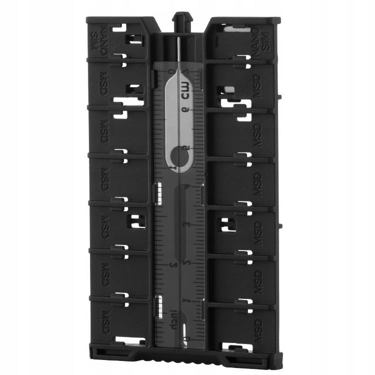 Всередині алюмінієвого корпусу є двостороння знімна шухляда з відсіками, профільованими для певних типів карт пам'яті. На одній стороні є 12 відділень для карт microSD (всіх підтипів), 2 відділення для Nano SIM-карт, а також шип для виймання SIM-карт і маленька лінійка 7 см. Інша сторона шухляди має 4 відділення для SD-карт (усі підтипи), відділення з адаптером для Micro-SIM-карт і плоский ключ для фотогвинтів.