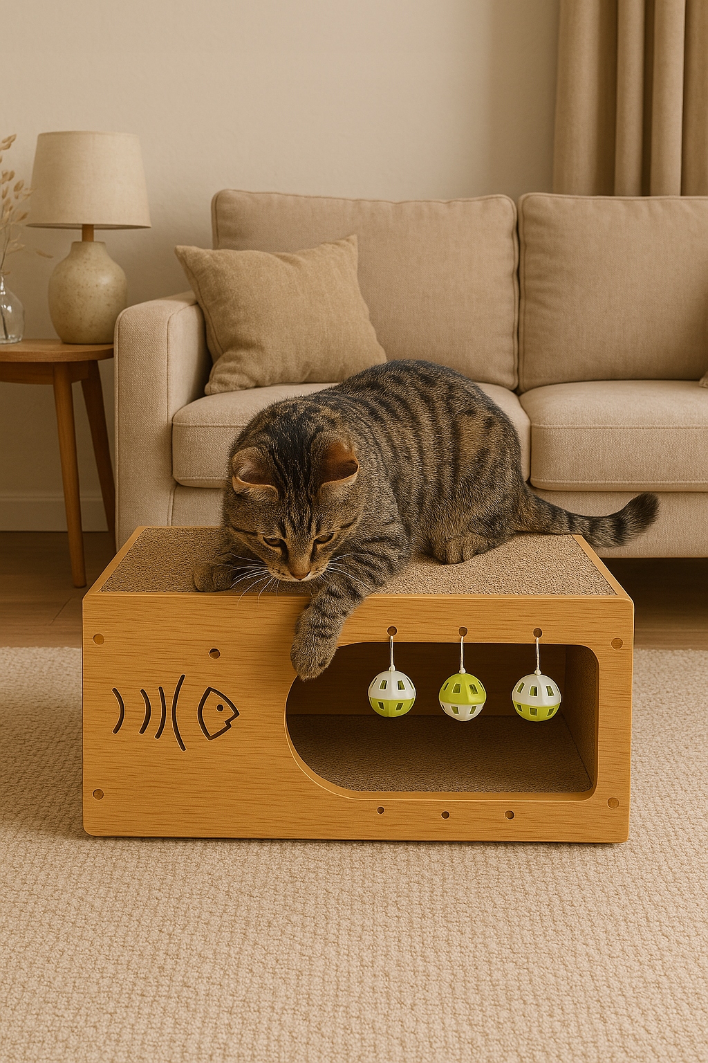 картонна подряпина для кішки. Картонне лігво з іграшкою