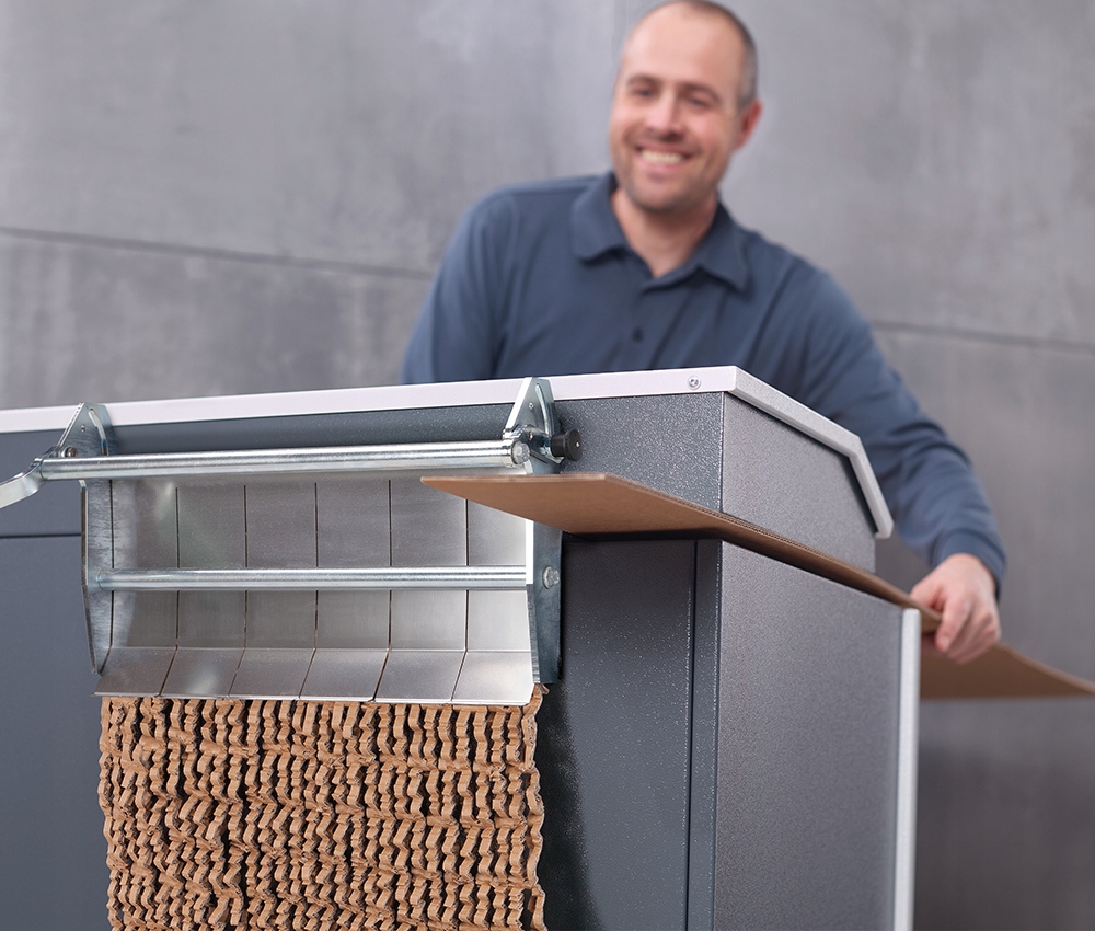 За допомогою цієї машини для виробництва захисного матеріалу пошкоджені картонні коробки можна перетворити на килимки для оббивки або наповнювальний матеріал за один робочий процес. Можливість мобільного та гнучкого використання як компактного настільного пристрою.