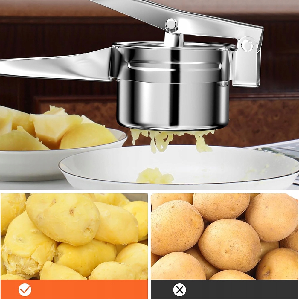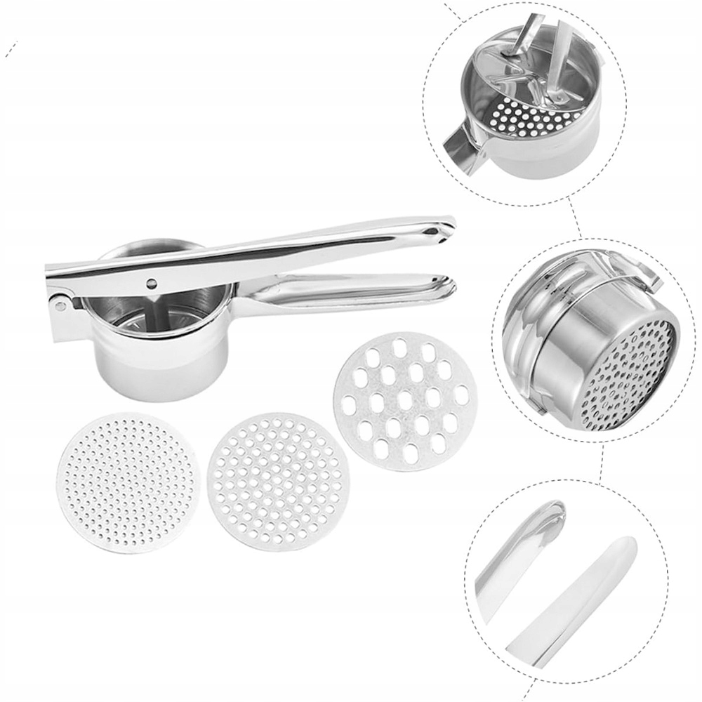 Цей прес для картоплі та шпецле виготовлено з нержавіючої сталі. У набір входять три різні перфоровані диски, наприклад, для приготування картопляного пюре або шпецле. Ручка має легку текстуру, що запобігає ковзанню пристрою під час прасування. Додаткова стабілізуюча накладка запобігає руху пристрою при використанні на горщиках. Прес слід ретельно очистити після використання, щоб запобігти розвитку бактерій і мікробів. Чистка дуже проста; Прес для картоплі можна мити в посудомийній машині. Прес для картоплі також можна використовувати для приготування інших фруктових або овочевих пюре, пасти, ньоккі, морозива для спагетті і, звичайно, шпецле.