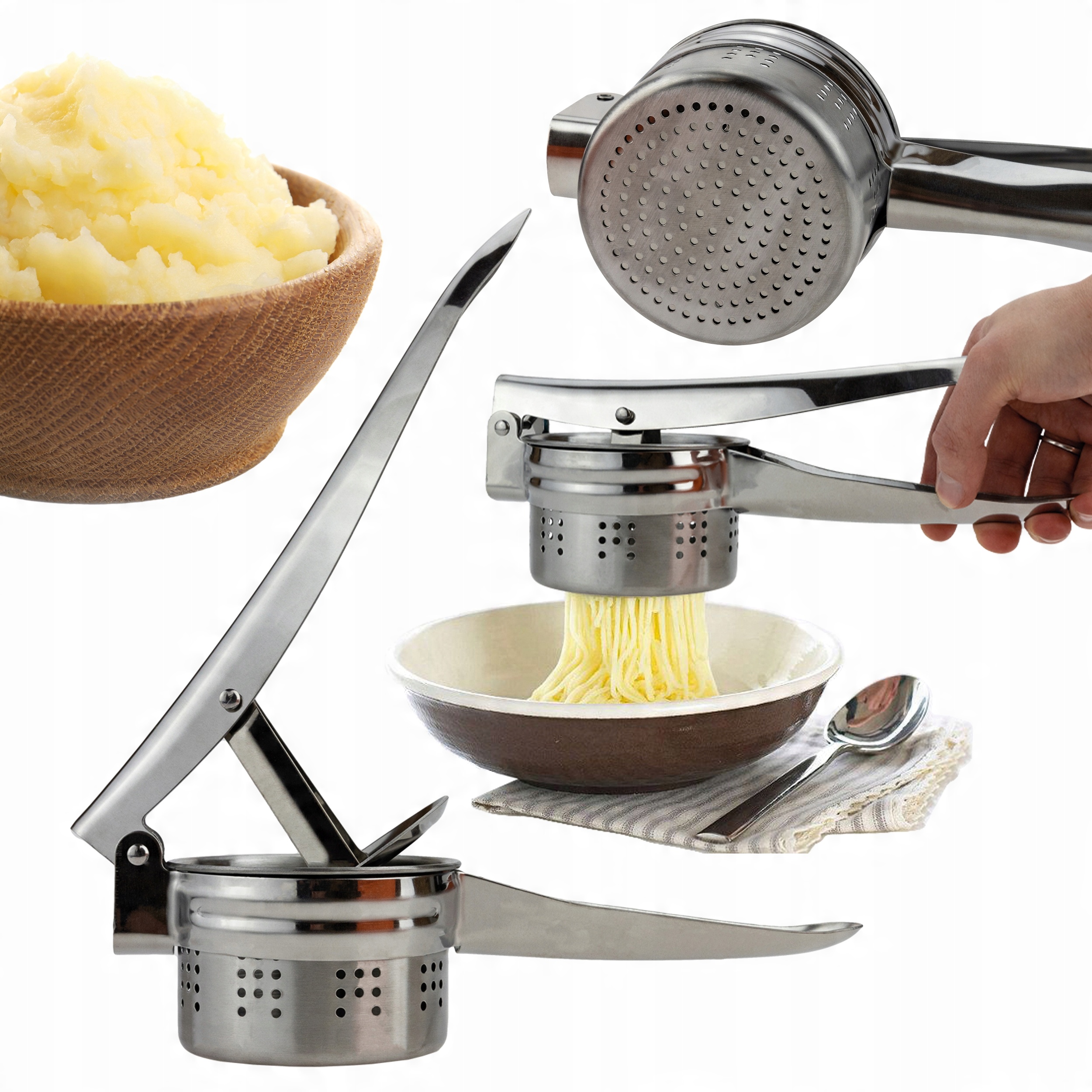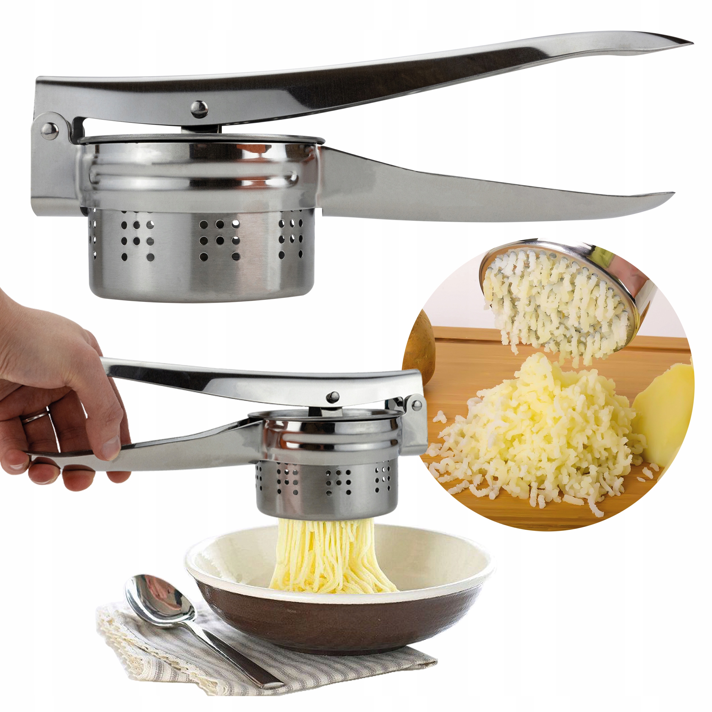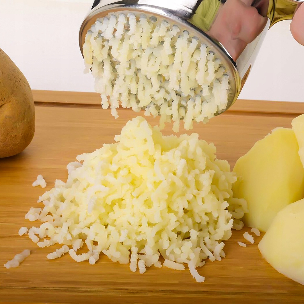 Кухонний інструмент, який дозволяє легко і швидко готувати картоплю різними способами. Завдяки йому ви можете швидко та легко віджати картоплю без грудочок, що важливо при приготуванні пюре, картопляних галушок або силезьких галушок.